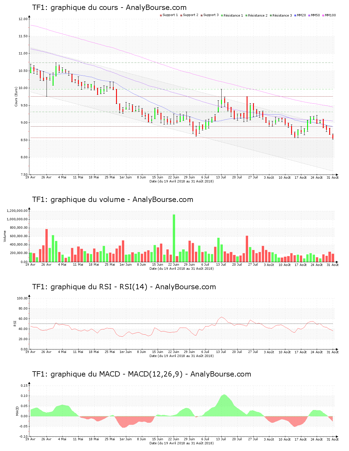 Ces informations constituent une analyse technique de la valeur TF1 au dimanche 2 septembre 2018. Cette analyse peut être invalidée par des éléments plus récents, et ne constitue en aucune manière une incitation d’achat ou de vente sur les marchés financiers. Le lecteur reste libre et responsable de l’interprétation et de l’usage faits de ces informations.