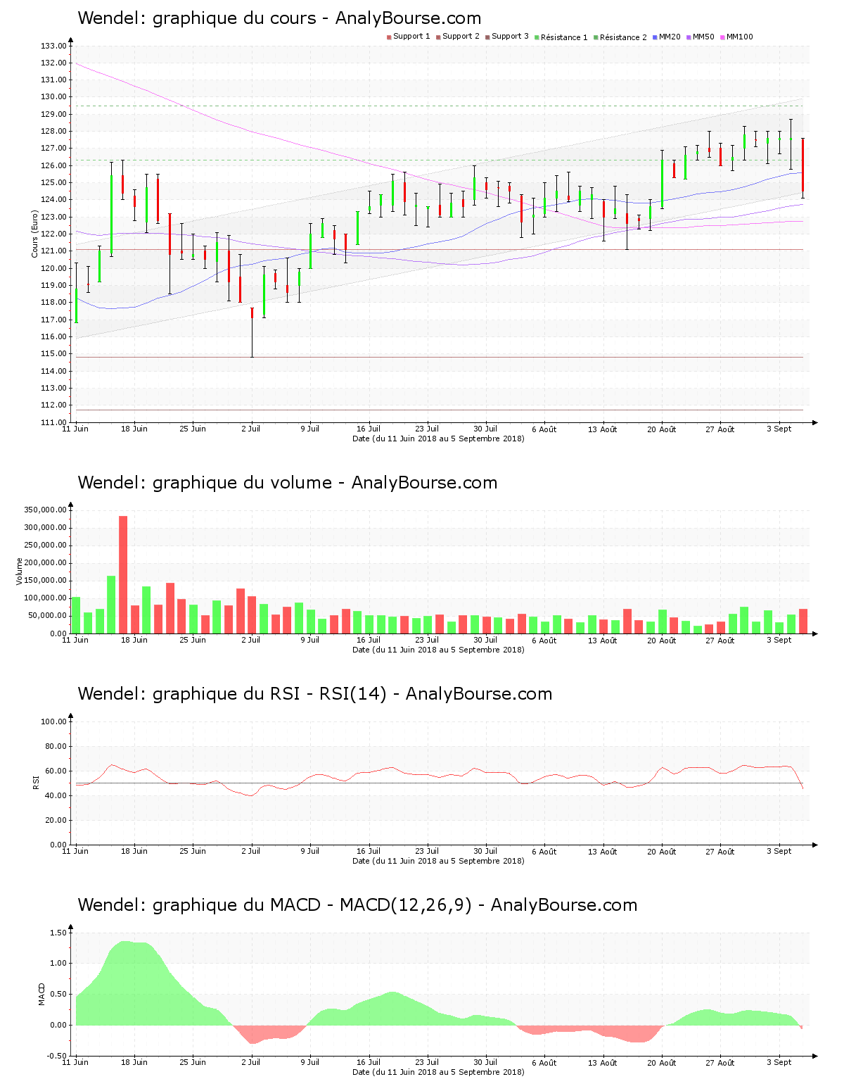L’action Wendel s’effrite ce mercredi 5 septembre, avec un parcours baissier de 2.43%, dans un volume d’à peu près 68000 actions échangées à la clôture. La valeur atteint finalement 124.500 €. Wendel subissait hier un équilibre des forces. L’action reprend ainsi son développement en diminution. Le titre oscille maintenant proche du support des 121.100 €.