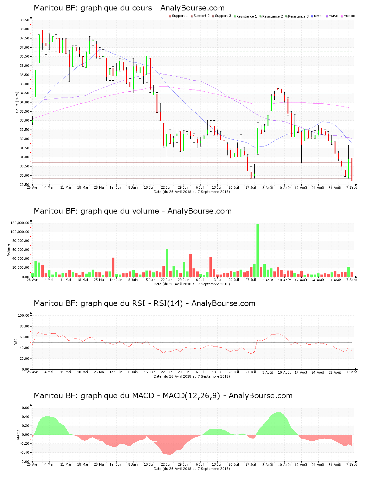Côté indicateurs, le RSI est stable ces cinq derniers jours. Ce dernier se positionne par conséquent encore au niveau de vente. La moyenne mobile sur vingt jours de l’action Manitou BF a croisé la moyenne mobile sur cinquante jours mercredi dernier. La moyenne mobile sur vingt jours de la valeur Manitou BF se positionne en-dessous de la moyenne mobile sur cinquante jours, qui se positionne quant à elle en deçà de la moyenne mobile sur cent jours. La valeur dévoile donc un cours décroissant sur la durée. Voici désormais 37 jours que la moyenne mobile sur cinquante jours de l’action Manitou BF se situe en deçà de sa moyenne mobile sur cent jours. Enfin, on constate que l’indicateur MACD est en conséquente diminution ces cinq dernières séances de cotations. Ce dernier indique maintenant une tendance du titre en grande régression sur le moyen-court terme.