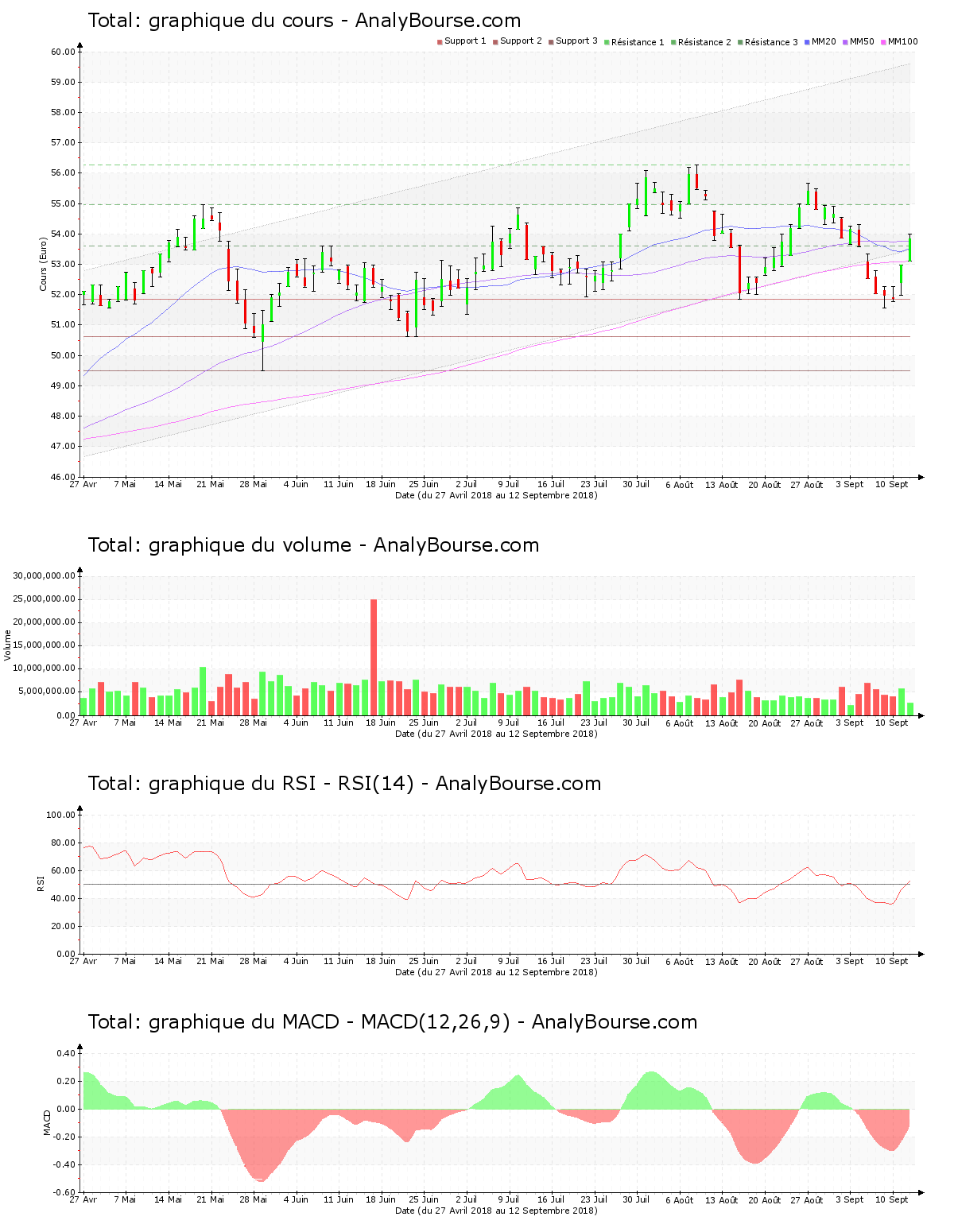 Avec à peu près 3 millions d’actions échangées à 15:40, avec un parcours en augmentation de 1.62%, la valeur Total est encore aujourd’hui désirée. Avec un parcours en progression de 2.12%, elle était déjà hier entourée. L’action atteint à présent la somme de 53.840 €. Le cours a dépassé la résistance des 53.600 € ce mercredi 12 septembre. La prochaine résistance se place à 54.950 €.