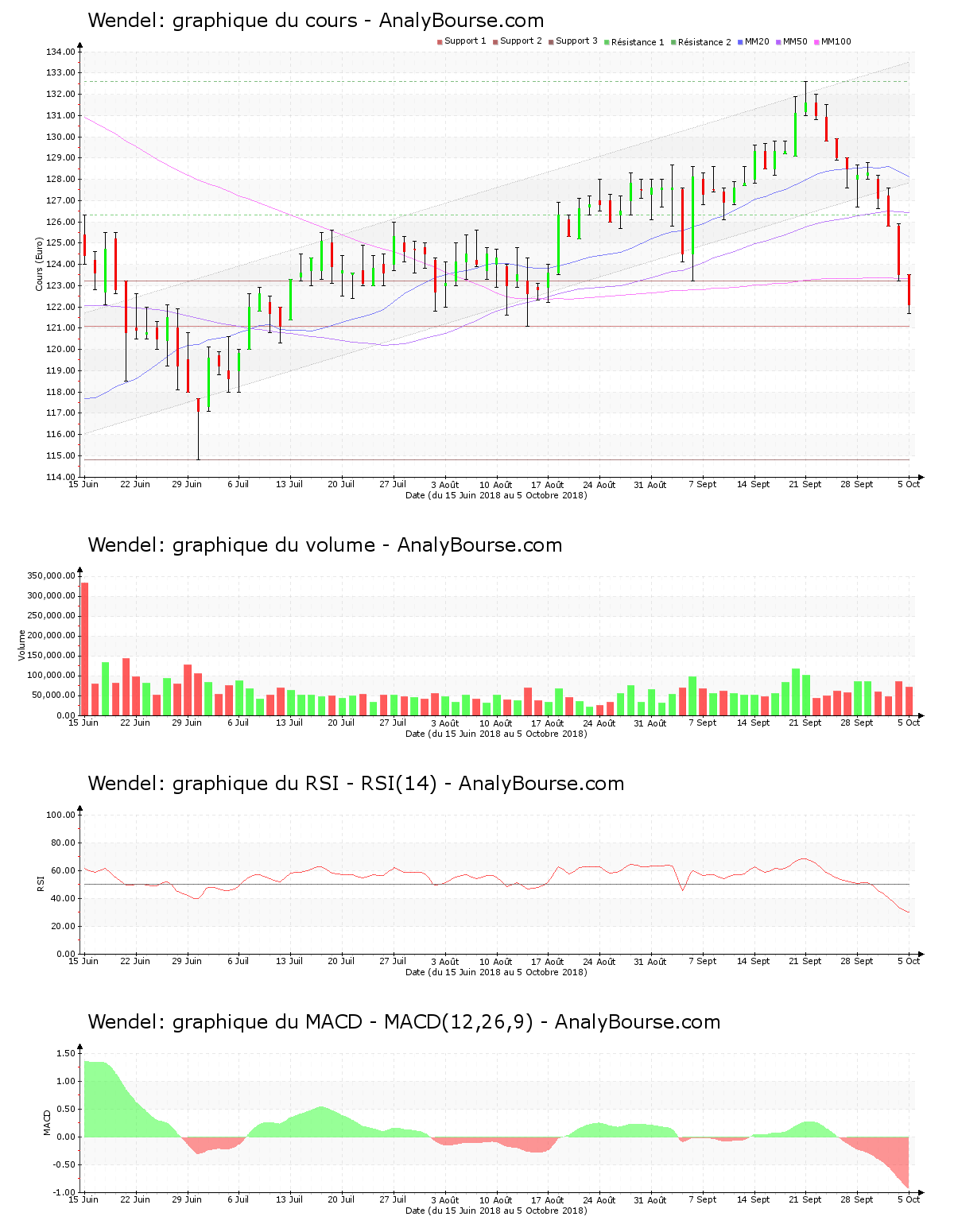L’indicateur RSI est en baisse ces dernières séances. C’est désormais dans le niveau de vente qu’il se trouve. Ensuite, l’action Wendel possède une moyenne mobile sur vingt jours placée au-delà de sa moyenne mobile sur cinquante jours, qui est quant à elle située au-delà de sa moyenne mobile sur cent jours. Le parcours de l’action est donc en progression sur une longue période. Depuis dorénavant 64 jours, la moyenne mobile sur vingt jours de la valeur Wendel se positionne au-dessus de sa moyenne mobile sur cinquante jours. Pour terminer, pour l’indicateur MACD, on note que ce dernier est en conséquente décroissance ces derniers jours. Ce dernier révèle à présent une évolution du titre en conséquente diminution sur le moyen-court terme.