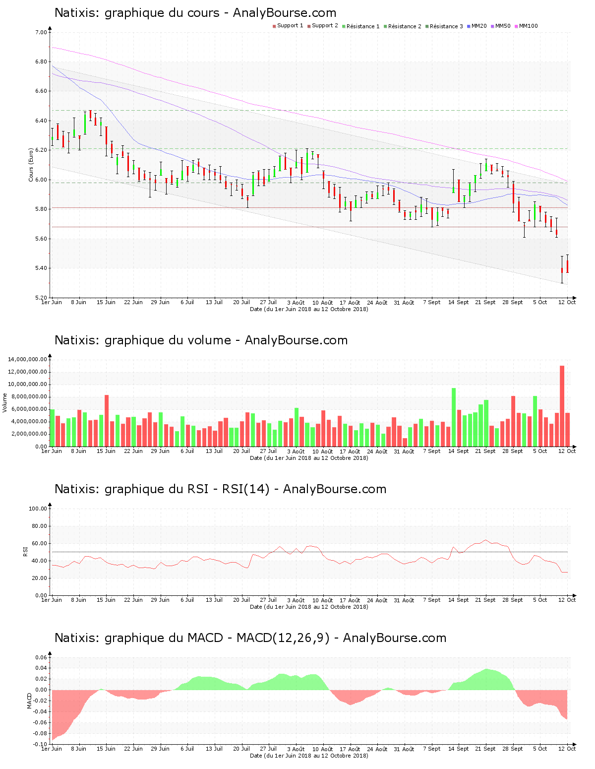 |Le résultat est toujours particulièrement négatif cette semaine pour la valeur Natixis, avec un cours en régression de 7.09%. L’action atteint maintenant la somme de 5.370 €. Avec un cours baissier de 1.03%, cette dernière était déjà en diminution la semaine dernière. Depuis la semaine dernière, l’action accentue ainsi son parcours baissier. Le titre a accusé également un gap à la baisse cette semaine jeudi dernier. Le cours a franchi le support des 5.680 € cette semaine. Enfin, avec un pourcentage de 9.06% qui éloigne le maximum du minimum de Natixis, on observe une sensible agitation ces cinq dernières séances de cotations sur le titre. L’action se trouve dans la limite inférieure du canal dans lequel elle fluctue depuis plusieurs semaines. L’action a abandonné 22.62%, depuis que cette dernière s’est retrouvée dans le canal le mercredi 7 mars 2018.