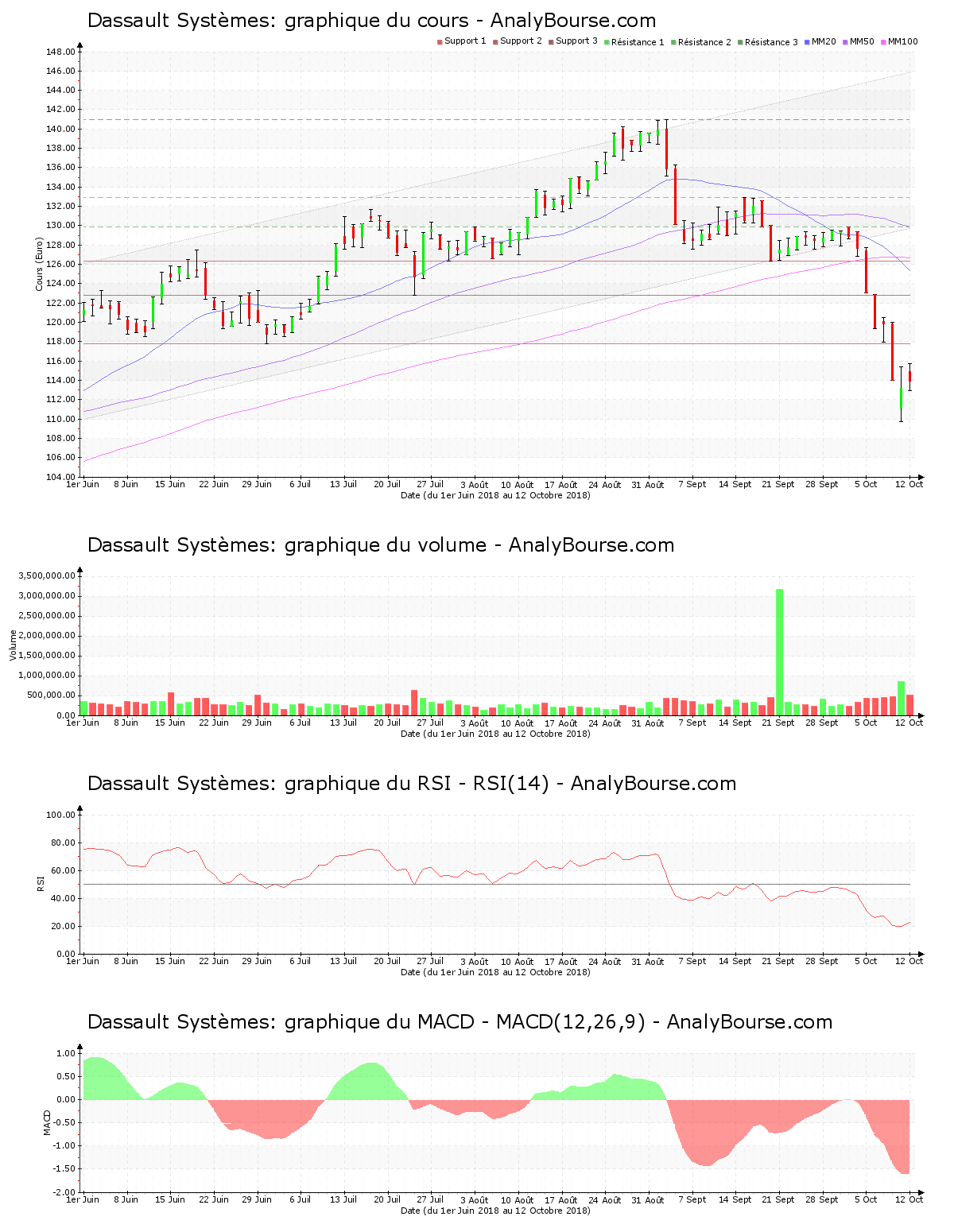 Matérialisée par un cours en décroissance de 7.36%, l’intention d’achat sur la valeur Dassault Systèmes ces dernières séances est encore très faible. L’action chute à présent de 9.050 €, partant de 123.000 € pour parvenir à 113.950 € ces cinq derniers jours. Avec un cours décroissant de 4.47%, cette dernière était déjà en forte diminution la semaine dernière. Le cours de Dassault Systèmes montre par conséquent ces deux dernières semaines une conséquente pression vendeuse, matérialisée par un cours en décroissance de 11.50% en deux semaines de cotations. On observe une importante agitation ces derniers jours sur le titre, avec un pourcentage de 11.99% séparant le plus haut du plus bas de la valeur. Enfin, le cours a passé le support des 117.750 € cette semaine. La valeur a dépassé la zone inférieure du canal dans lequel cette dernière évoluait depuis quelques temps. ? présent, elle évolue très en-dessous de son canal.