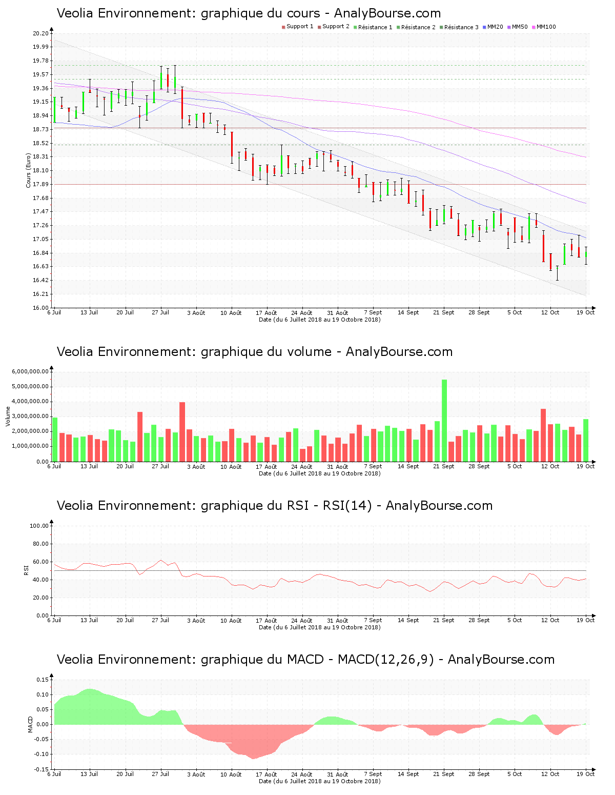 Concernant les indicateurs, en ce qui concerne le RSI, on observe qu’il est relativement stable ces cinq dernières séances de cotations. Ce dernier se positionne ainsi encore au niveau de vente. Ensuite, la moyenne mobile sur vingt jours de la valeur Veolia Environnement est localisée en deçà de sa moyenne mobile sur cinquante jours, qui est quant à elle positionnée en deçà de sa moyenne mobile sur cent jours. Sur le long terme, la valeur dévoile par conséquent un comportement baissier. Depuis à présent 48 séances, la moyenne mobile sur vingt jours de l’action Veolia Environnement se place en deçà de sa moyenne mobile sur cinquante jours. Le MACD est en croissance ces cinq dernières séances de cotations. Il indique dorénavant une évolution du cours assez stable sur le moyen-court terme. Le MACD a basculé en secteur positif hier, cela peut suggérer un amorcement d’une orientation croissante sur une longue période pour Veolia Environnement.