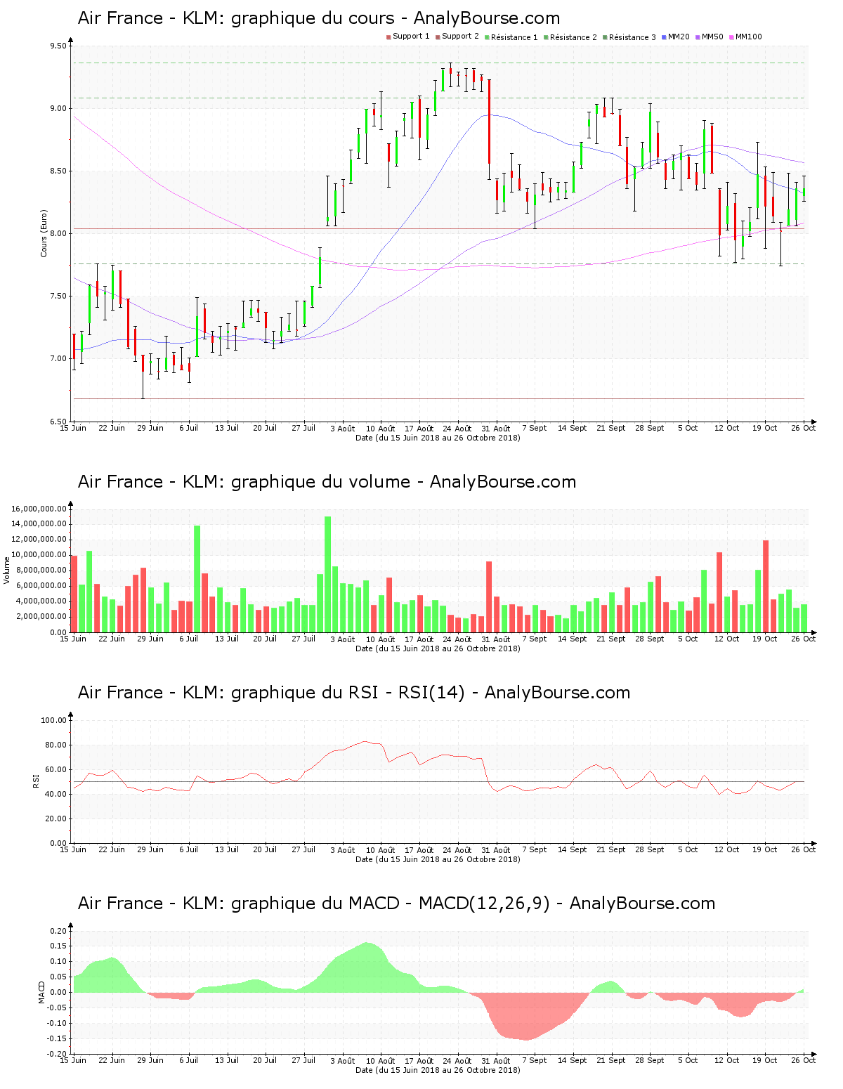 En ce qui concerne les indicateurs, en ce qui concerne l’indicateur MACD, on observe qu’il est en hausse ces dernières séances. Il dessine désormais une tendance du titre assez stable à court-moyen terme. Le MACD a basculé en territoire positif jeudi dernier, ce qui pourrait dévoiler un prémice d’une trajectoire croissante sur la durée pour Air France – KLM. De son côté, l’indicateur RSI est en progression ces derniers jours. C’est désormais dans le niveau neutre que ce dernier se situe. La moyenne mobile sur 50 jours de la valeur Air France – KLM se localise à présent au-delà de sa moyenne mobile sur 100 jours depuis 48 séances de cotations.
