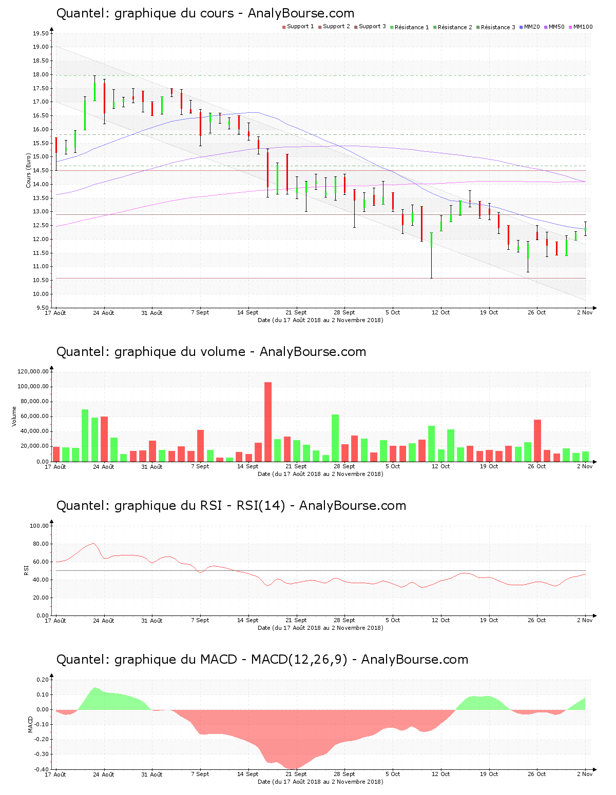 |Quantel est ces derniers jours demandé, avec un comportement en hausse de 3.33%. L’action s’apprécie désormais à 12.400 €. Avec un cours en décroissance de 6.98%, Quantel était par contre en solide baisse la semaine dernière. La valeur Quantel rebondit par conséquent sensiblement ces cinq derniers jours de cotations. Avec un taux de 11.27% qui écarte le plus haut du plus bas de l’action, on relève une substantielle fébrilité ces derniers jours sur le cours. La valeur navigue largement au-dessus de son canal. Elle ne varie en effet plus dans le canal dans lequel cette dernière se bornait depuis plusieurs semaines.