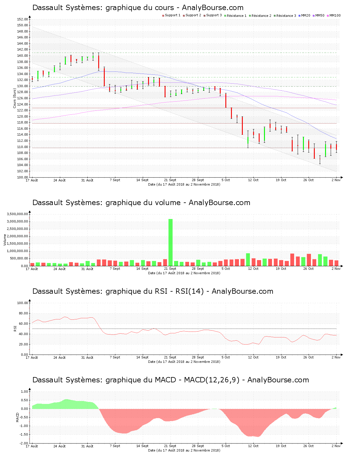 En ce qui concerne les indicateurs, la moyenne mobile sur vingt jours de l’action Dassault Systèmes se place en deçà de la moyenne mobile sur cinquante jours, et la moyenne mobile sur cinquante jours se situe pour sa part en deçà de la moyenne mobile sur cent jours. Sur le long terme, l’action traduit donc un mouvement baissier. De son côté, on note que le MACD est en vigoureuse progression ces derniers jours. C’est maintenant une tendance du cours en grande progression que ce dernier dévoile sur le court-moyen terme. Le MACD a basculé du côté positif vendredi dernier, ceci peut dessiner un prélude d’une trajectoire croissante à longue échéance pour Dassault Systèmes. Pour terminer, pour l’indicateur RSI, on note que ce dernier est stable ces cinq dernières séances de cotations. Il se place donc toujours dans le niveau de vente.