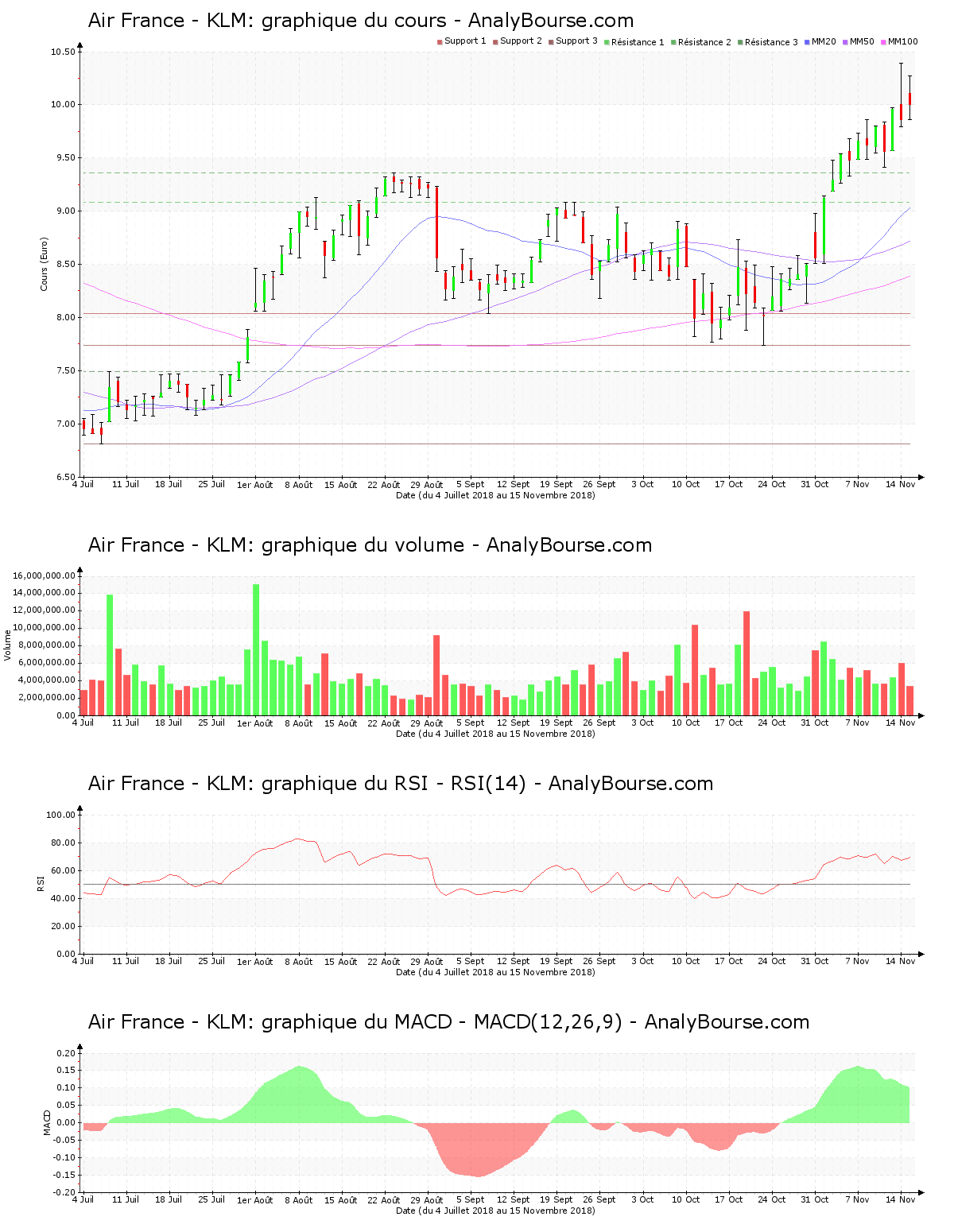 Le parcours est encourageant ce jeudi 15 novembre pour Air France – KLM, avec un comportement haussier de 1.42%, dans un volume de 3 millions de titres échangés à 13:41. L’action atteint désormais 10.000 €. Air France – KLM était à l’opposé hier attaqué, avec un développement en diminution de 1.00%. L’action Air France – KLM rebondit donc légèrement ce jeudi. On constate une relative volatilité ce jeudi sur le cours, avec un taux de 4.16% éloignant les extrêmes de Air France – KLM.