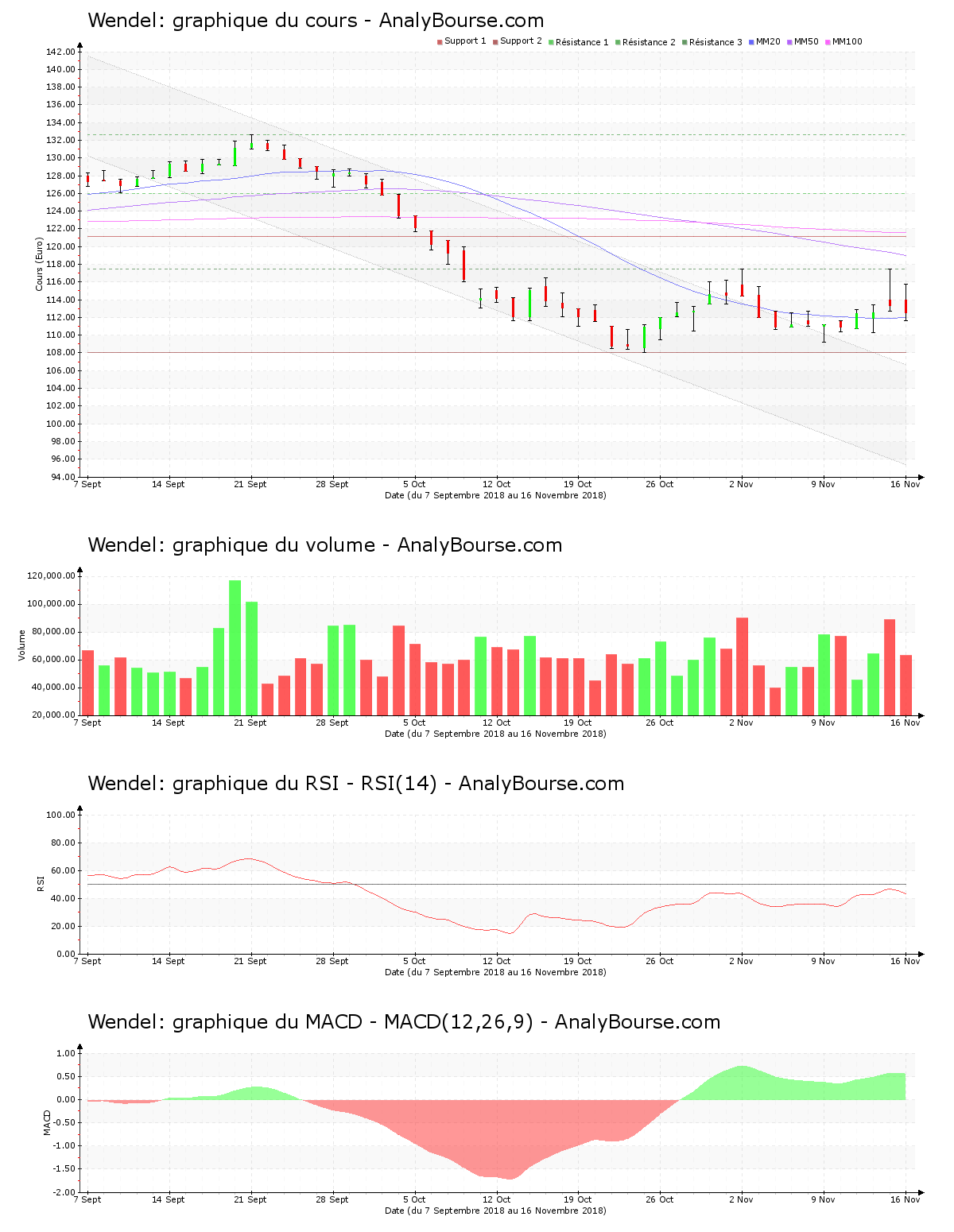 En ce qui concerne les indicateurs, l’indicateur RSI est plutôt stable ces dernières séances. Ce dernier se situe ainsi encore au niveau de vente. Pour sa part, le MACD est ces dernières séances en forte hausse. C’est finalement une tendance du titre en conséquente hausse que ce dernier signale à moyen-court terme. Enfin, la moyenne mobile sur vingt jours de la valeur Wendel se place en deçà de la moyenne mobile sur cinquante jours, qui se situe quant à elle en-dessous de la moyenne mobile sur cent jours. Sur le long terme, la valeur présente par conséquent un mouvement en diminution.