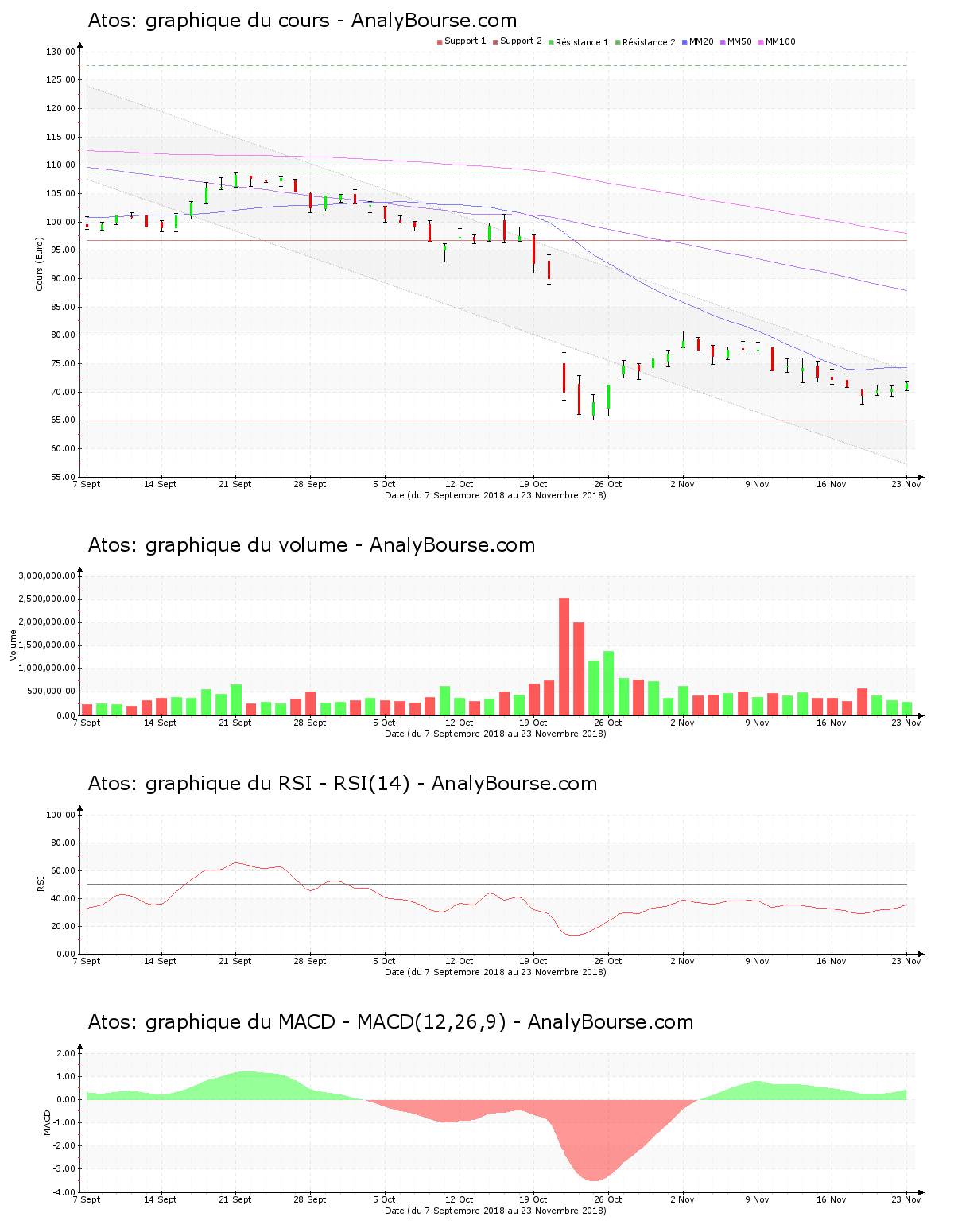 Pour les indicateurs, le RSI est ces derniers jours relativement stable. Ce dernier se place par conséquent encore dans le niveau de vente. Le MACD est en vigoureuse régression ces cinq derniers jours. Il dévoile toutefois toujours une tendance du titre en forte croissance à moyen terme. La moyenne mobile sur 20 jours de la valeur Atos se localise en deçà de la moyenne mobile sur 50 jours, qui se positionne elle-même en-dessous de la moyenne mobile sur 100 jours. Sur une longue période, le parcours de l’action est ainsi en baisse. Depuis à présent 67 séances, la moyenne mobile sur 50 jours de la valeur Atos se situe en deçà de sa moyenne mobile sur 100 jours.