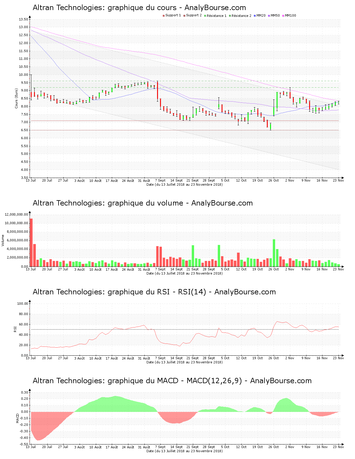 Avec un mouvement haussier de 5.34%, Altran Technologies est en grande augmentation ces cinq derniers jours de cotations. L’action atteint désormais la somme de 8.280 €. Caractérisée par un cours décroissant de 4.61%, Altran Technologies subissait par contre la semaine dernière une vigoureuse pression vendeuse. La tendance se retourne par conséquent de manière sensible cette semaine. Avec un pourcentage de 6.92% qui éloigne le plus haut du plus bas de Altran Technologies, on note une certaine volatilité ces cinq derniers jours de cotations sur le cours. L’action se développe juste au-delà de son canal. Elle ne se développe en effet plus dans le canal dans lequel elle se bornait depuis quelques temps.