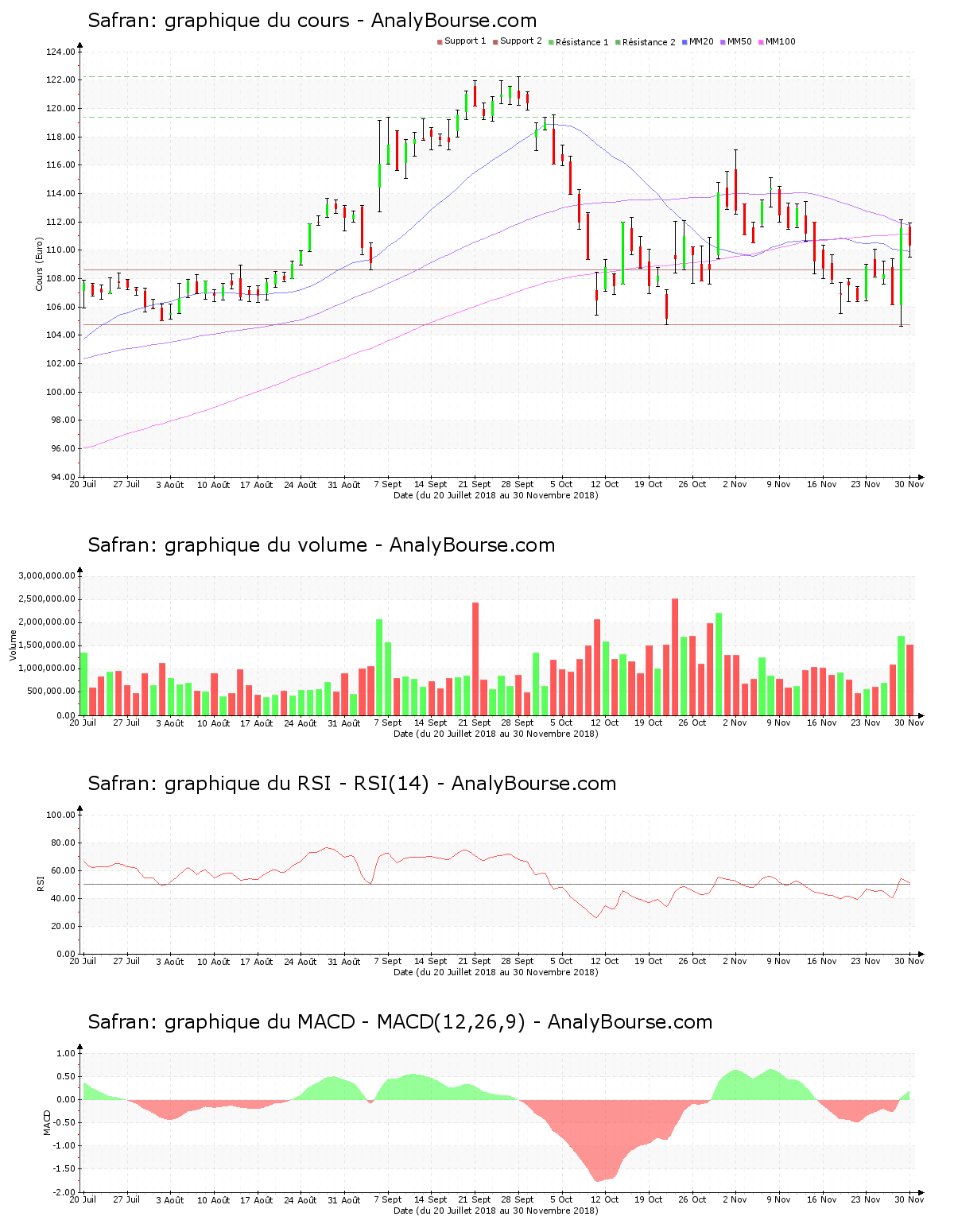 Ces informations constituent une analyse technique de la valeur Safran au samedi 1er décembre 2018. Cette analyse peut être invalidée par des éléments plus récents, et ne constitue en aucune manière une incitation d’achat ou de vente sur les marchés financiers. Le lecteur reste libre et responsable de l’interprétation et de l’usage faits de ces informations.