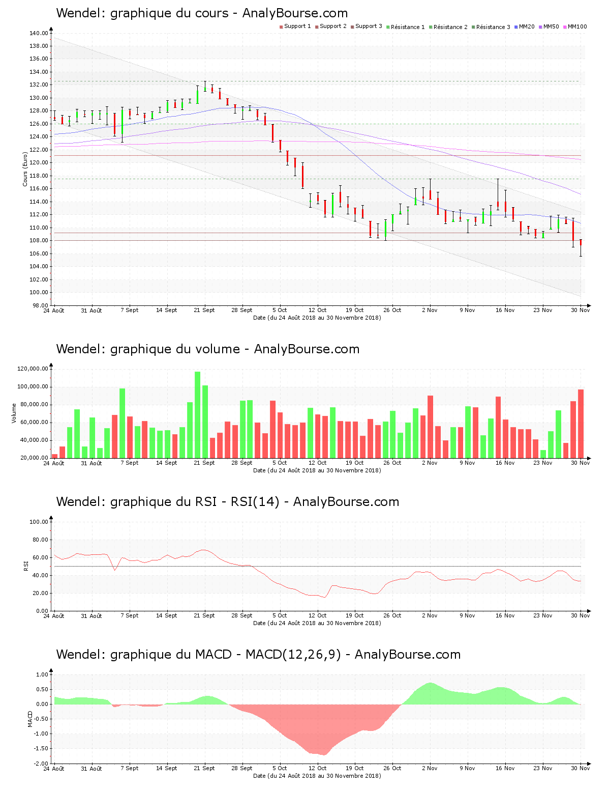 Ces informations constituent une analyse technique de la valeur Wendel au dimanche 2 décembre 2018. Cette analyse peut être invalidée par des éléments plus récents, et ne constitue en aucune manière une incitation d’achat ou de vente sur les marchés financiers. Le lecteur reste libre et responsable de l’interprétation et de l’usage faits de ces informations.