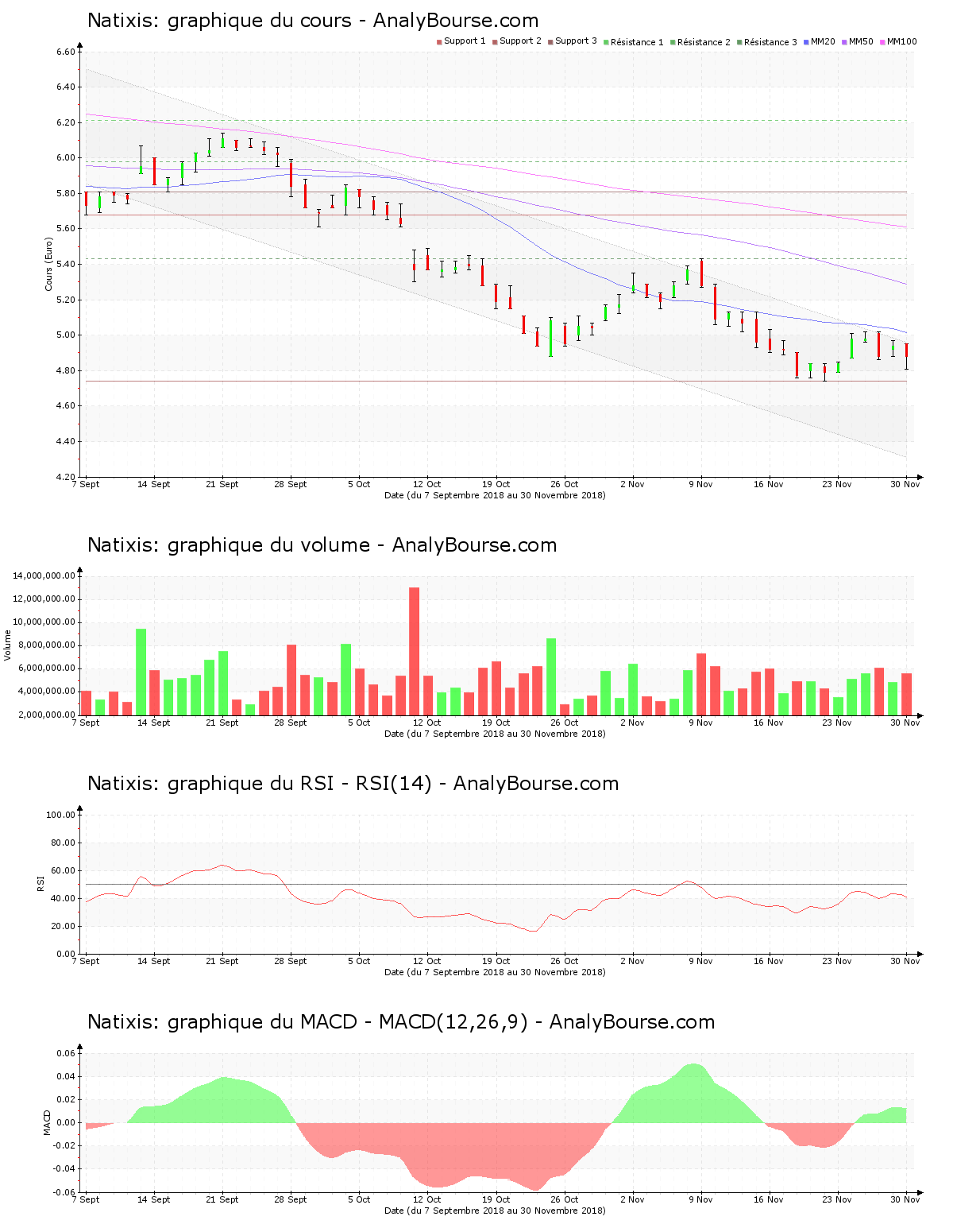 Concernant les indicateurs, l’indicateur RSI est ces dernières séances assez stable. C’est donc toujours dans le niveau de vente qu’il se positionne. Ensuite, on note que l’indicateur MACD est en croissance ces cinq dernières séances de cotations. Il esquisse désormais une tendance du titre stable sur le court-moyen terme. Mardi dernier, le MACD a basculé en secteur positif, cela pourrait suggérer une amorce d’une évolution en hausse sur une longue période pour Natixis. Pour finir, la valeur Natixis possède une moyenne mobile sur 20 jours positionnée en deçà de sa moyenne mobile sur 50 jours, qui est pour sa part localisée en deçà de sa moyenne mobile sur 100 jours. Sur le long terme, le développement de l’action est donc en baisse.