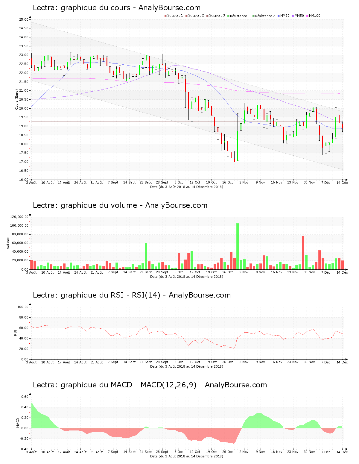 Pour les indicateurs, l’indicateur RSI est ces cinq derniers jours stable. Ce dernier se localise donc encore au niveau neutre. Pour sa part, la valeur Lectra dispose d’une moyenne mobile sur 20 jours positionnée en deçà de sa moyenne mobile sur 50 jours, qui est pour sa part localisée en deçà de sa moyenne mobile sur 100 jours. ? long terme, le comportement de l’action est par conséquent en régression. Cela fait finalement 55 jours que la moyenne mobile sur 20 jours de la valeur Lectra se place en deçà de sa moyenne mobile sur 50 jours. Le MACD est en substantielle croissance ces derniers jours. C’est désormais une trajectoire du titre en croissance qu’il suggère à moyen terme. Mercredi dernier, le MACD est passé du côté positif, ce qui pourrait dessiner un commencement d’une orientation croissante sur la durée pour Lectra.