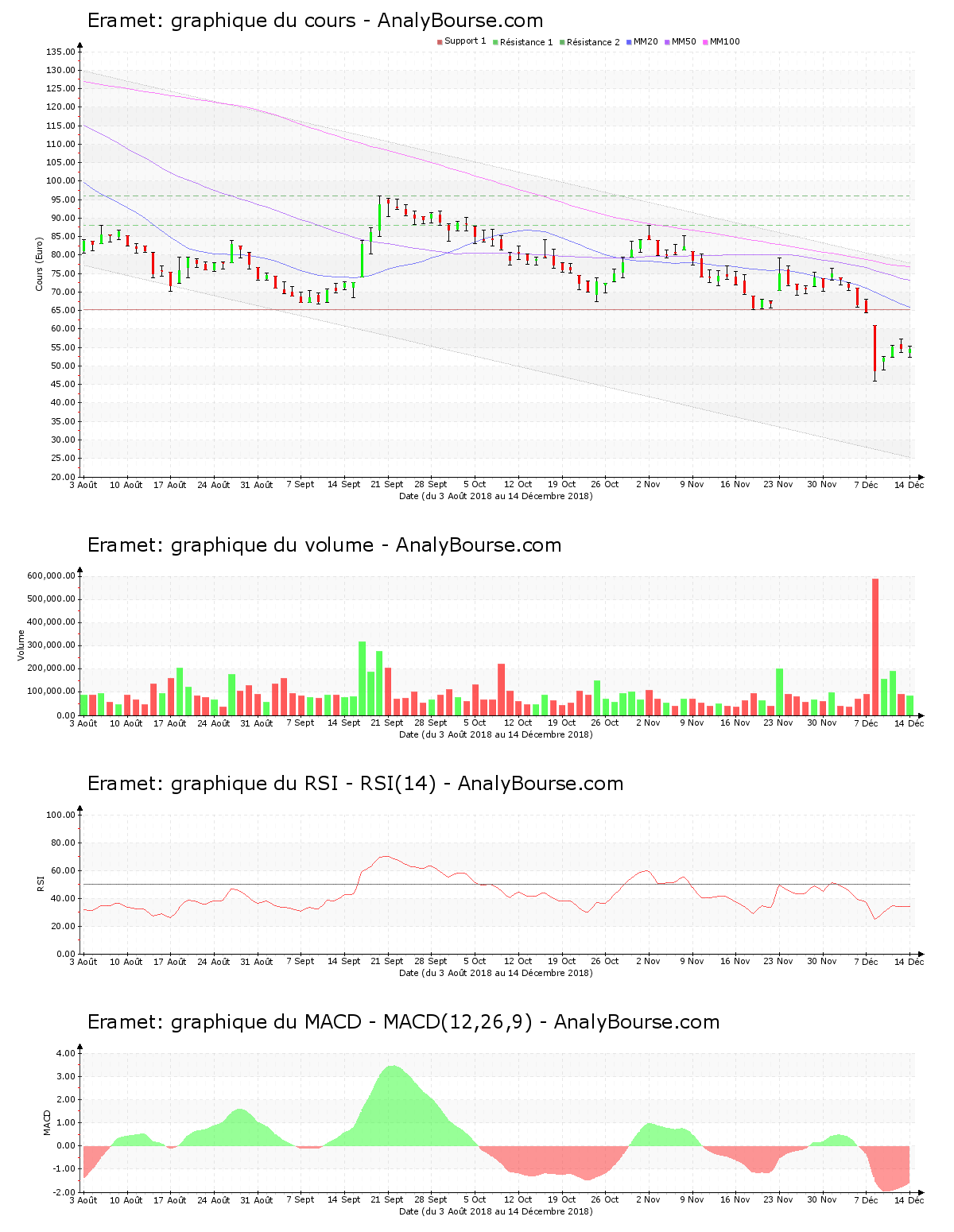 Côté indicateurs, en ce qui concerne le MACD, on note que ce dernier est en importante baisse ces cinq dernières séances de cotations. Il esquisse désormais une tendance du cours en solide baisse à moyen-court terme. La valeur Eramet possède une moyenne mobile sur 20 jours placée en deçà de sa moyenne mobile sur 50 jours, qui est pour sa part placée en-dessous de sa moyenne mobile sur 100 jours. L’action traduit par conséquent un cours baissier à longue échéance. Voici dorénavant 34 séances que la moyenne mobile sur 20 jours de l’action Eramet se trouve en deçà de sa moyenne mobile sur 50 jours. Pour finir, l’indicateur RSI est relativement stable ces cinq dernières séances. Ce dernier se trouve donc encore au niveau de vente.