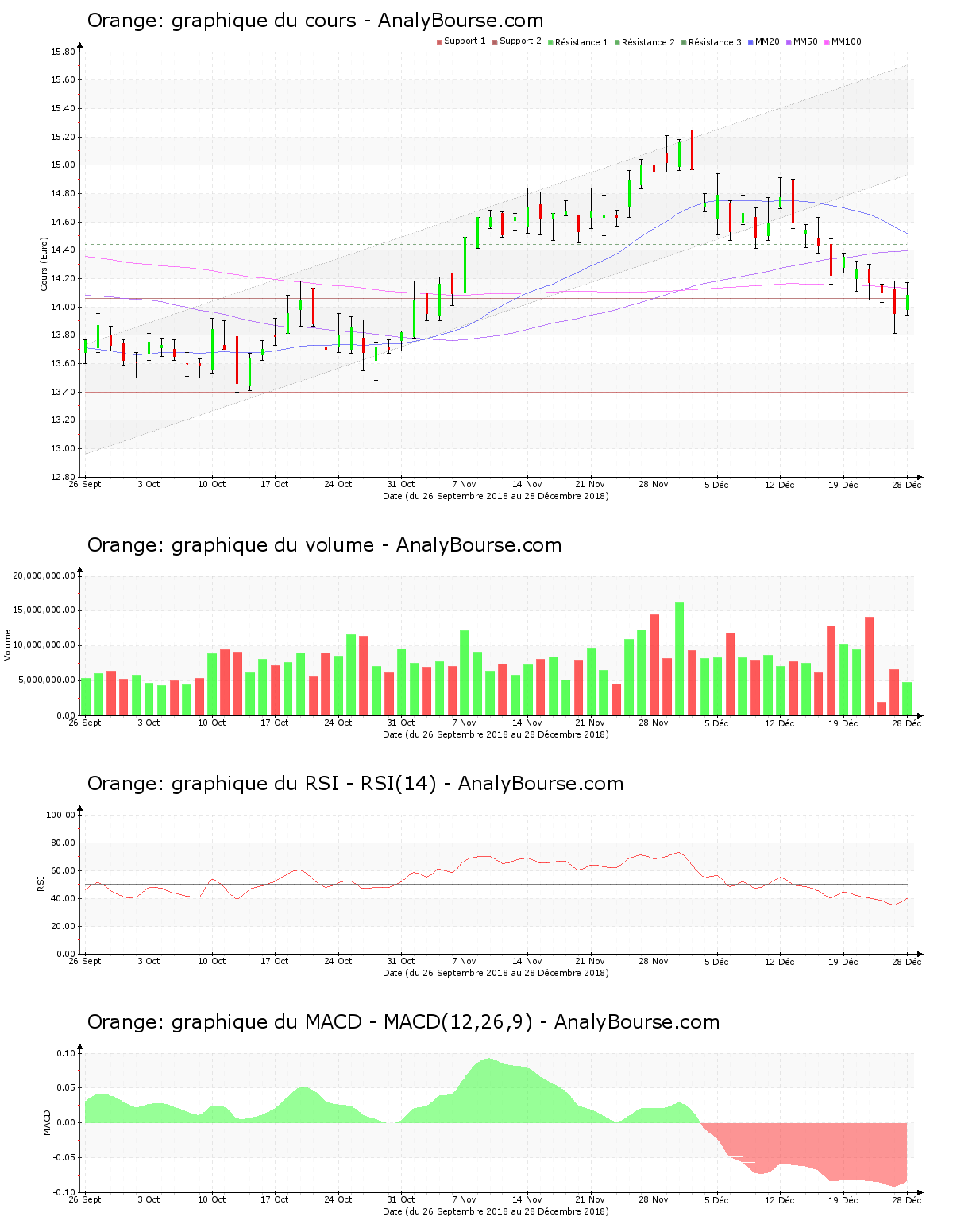 Ces informations constituent une analyse technique de l’action Orange au samedi 29 décembre 2018. Cette analyse peut être invalidée par des éléments plus récents, et ne constitue en aucune manière une incitation d’achat ou de vente sur les marchés financiers. Le lecteur reste libre et responsable de l’interprétation et de l’usage faits de ces informations.