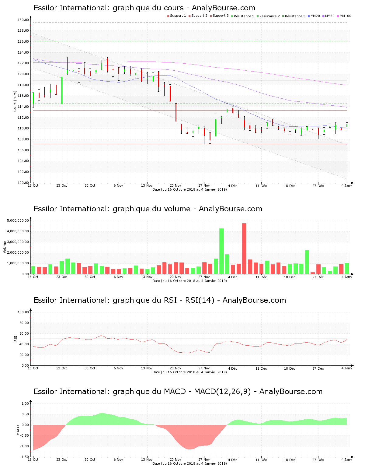 Ces informations constituent une analyse technique de la valeur Essilor International au samedi 5 janvier 2019. Cette analyse peut être invalidée par des éléments plus récents, et ne constitue en aucune manière une incitation d’achat ou de vente sur les marchés financiers. Le lecteur reste libre et responsable de l’interprétation et de l’usage faits de ces informations.
