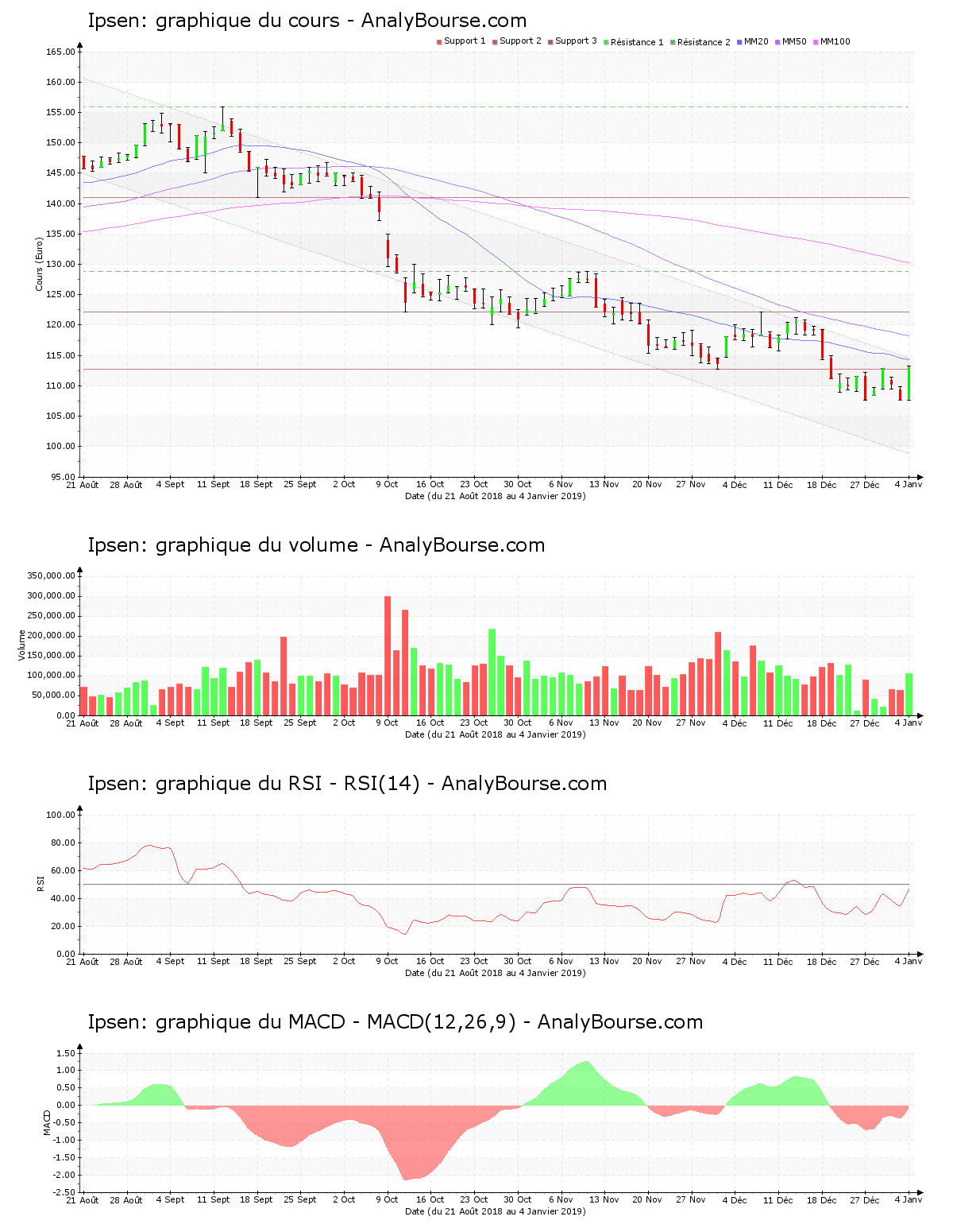 Ces informations constituent une analyse technique de la valeur Ipsen au dimanche 6 janvier 2019. Cette analyse peut être invalidée par des éléments plus récents, et ne constitue en aucune manière une incitation d’achat ou de vente sur les marchés financiers. Le lecteur reste libre et responsable de l’interprétation et de l’usage faits de ces informations.