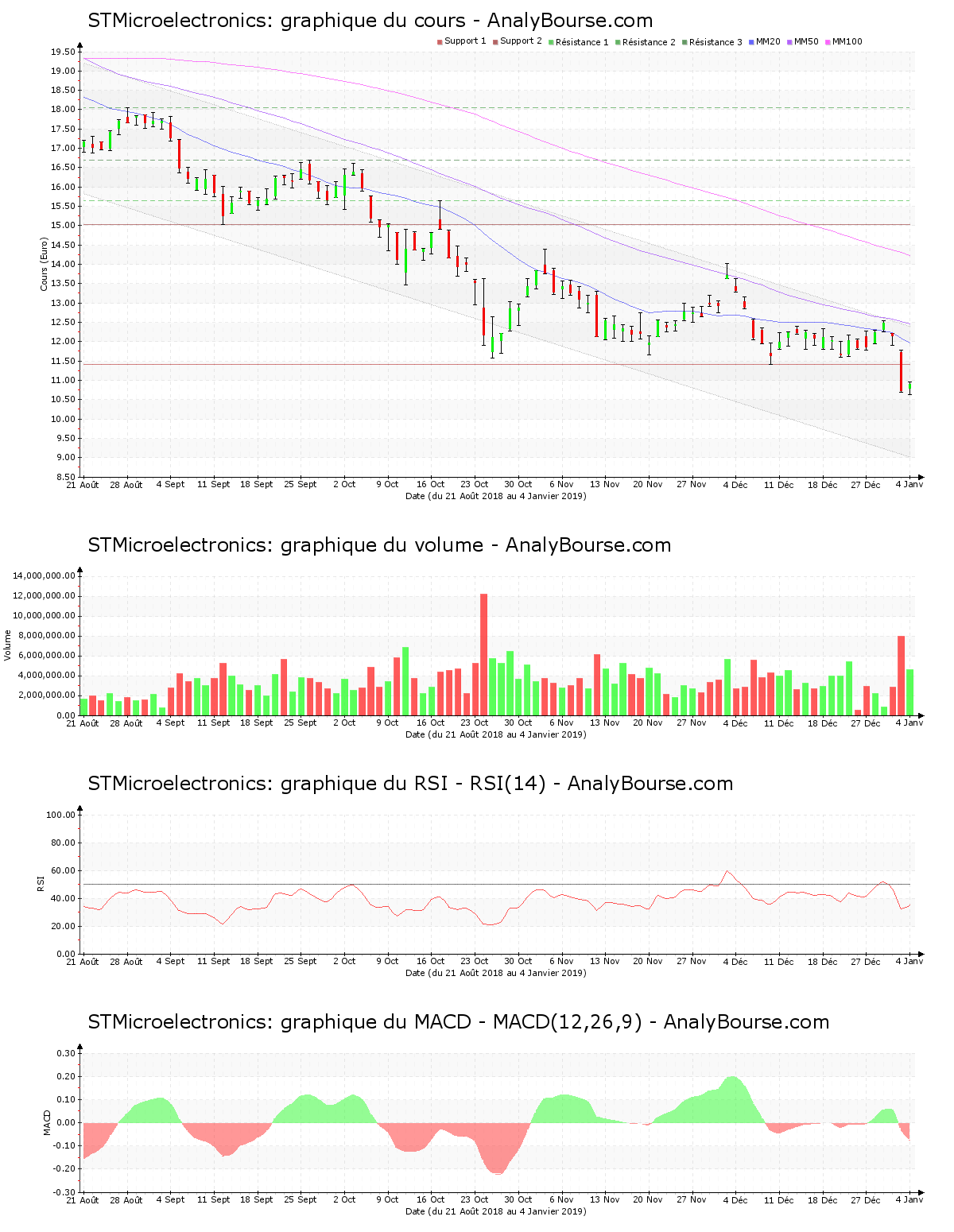 L’action STMicroelectronics possède une moyenne mobile sur vingt jours placée en deçà de sa moyenne mobile sur cinquante jours, qui est pour sa part située en deçà de sa moyenne mobile sur cent jours. Sur la durée, le parcours de l’action est ainsi en décroissance. Voilà désormais 96 séances que la moyenne mobile sur cinquante jours de la valeur STMicroelectronics se place en deçà de sa moyenne mobile sur cent jours. De son côté, le RSI est plutôt stable ces derniers jours. Ce dernier se trouve ainsi toujours au niveau de vente. On repère que l’indicateur MACD est en ferme baisse ces dernières séances. C’est maintenant une tendance du titre en substantielle baisse qu’il caractérise à moyen-court terme.