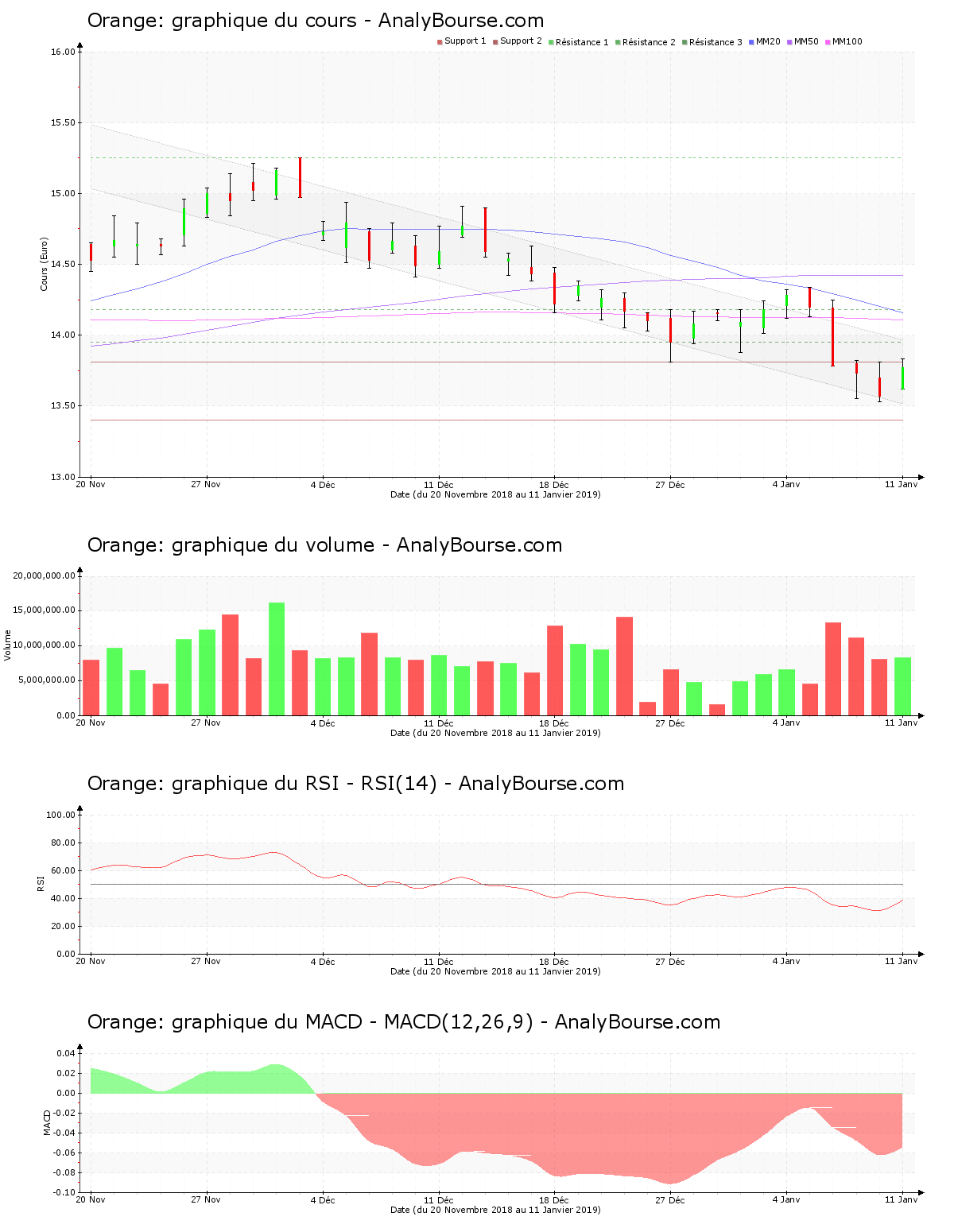 Il s’agit de la première fois que l’action Orange passe ce seuil depuis plus de 49 séances. Le parcours est décourageant ces derniers jours pour Orange, avec un mouvement baissier de 3.57%. La valeur atteint désormais 13.770 €. Orange s’appréciait par contre la semaine dernière, avec un parcours haussier de 2.37%. La répartition acheteurs/vendeurs se retourne donc un peu ces cinq derniers jours de cotations. Notons, avec un taux de 5.99% distançant ces cinq dernières séances de cotations les extrêmes, des échanges assez volatils sur Orange. Le cours a dépassé le support des 13.810 € cette semaine. Le support suivant se situe à 13.400 €. C’est au milieu de son canal que la valeur fluctue.