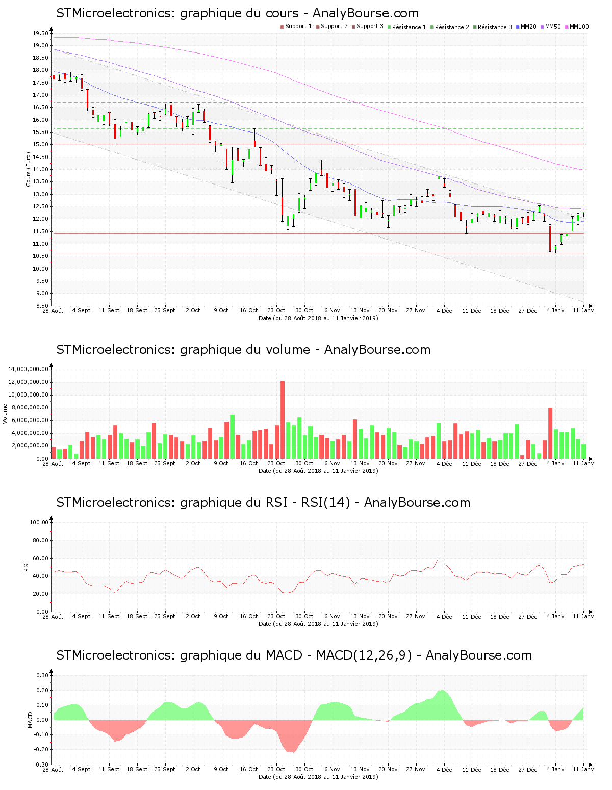 En ce qui concerne les indicateurs, concernant le RSI, on note qu’il est en progression ces cinq derniers jours de cotations. Ce dernier se trouve finalement dans le niveau neutre. De son côté, le MACD est en forte progression ces cinq derniers jours de cotations. C’est maintenant une évolution du titre en ferme hausse que ce dernier esquisse à moyen terme. Le MACD a basculé en terrain positif mercredi dernier, ceci pourrait caractériser une amorce d’une évolution croissante sur une longue période pour STMicroelectronics. Enfin, la moyenne mobile sur vingt jours de la valeur STMicroelectronics est située en deçà de sa moyenne mobile sur cinquante jours, qui est pour sa part située en deçà de sa moyenne mobile sur cent jours. L’action présente ainsi un parcours baissier sur la durée.