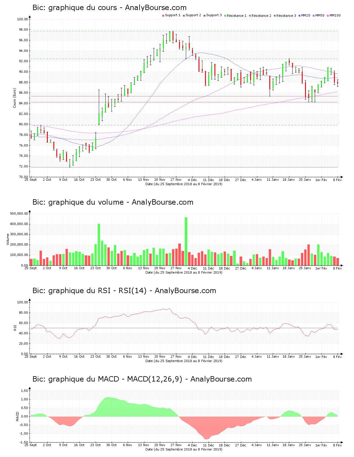 Le volume est en régression ces cinq derniers jours de cotations pour l’action Bic, avec une valeur moyenne par séance de 90000 actions échangées, moins que les 149000 de la semaine dernière. Ce volume en décroissance esquisse une perte d’intéret sur la valeur.