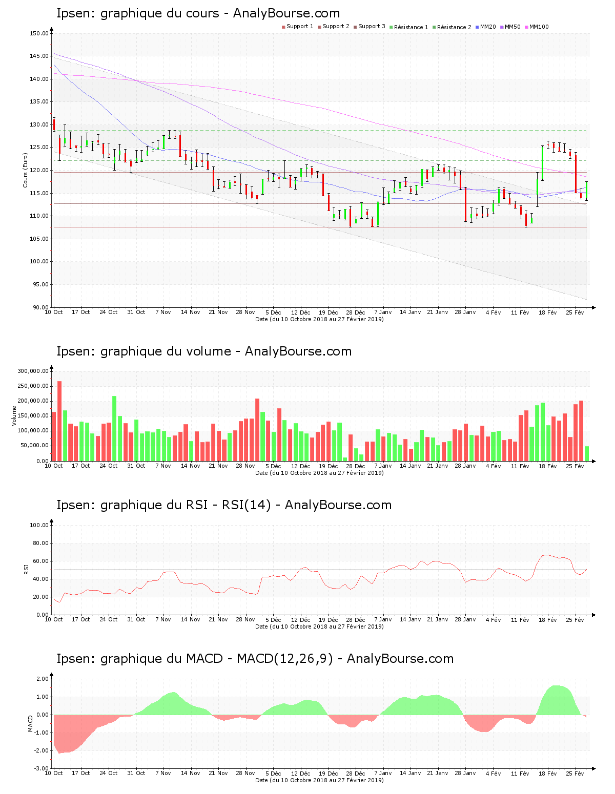 Le MACD est ce mercredi en vigoureuse baisse. Ce jour, le MACD a basculé en terrain négatif, cela pourrait révèler une amorce de tendance décroissante pour l’action Ipsen à longue échéance. Le RSI est aujourd’hui en progression. Il a basculé dans le niveau d’achat, cela pourrait dessiner une amorce d’une évolution en progression sur la durée pour l’action Ipsen.