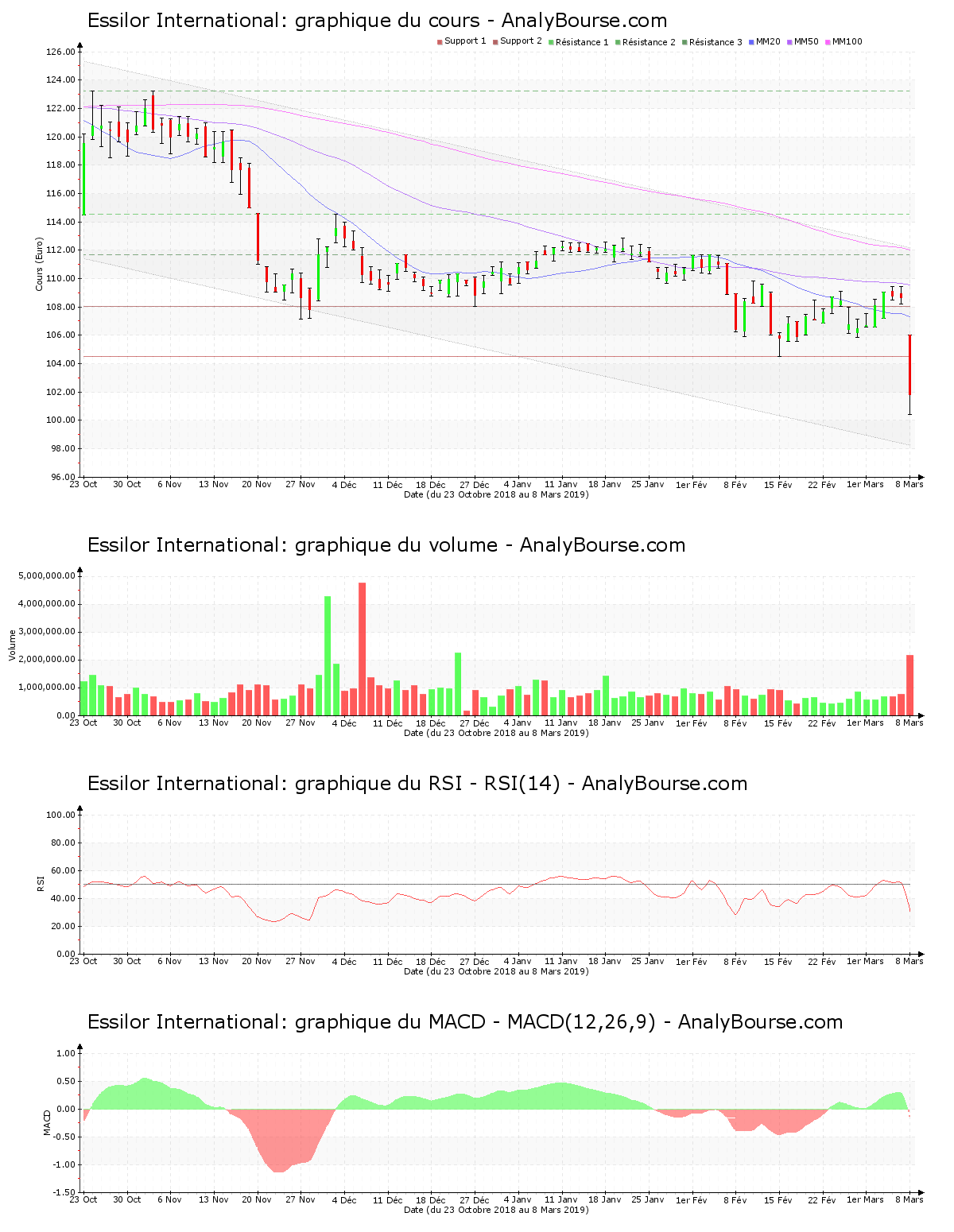 Côté indicateurs, on observe que l’indicateur RSI est en décroissance ce jour. Il a basculé dans le niveau de vente, ceci peut esquisser un amorcement de tendance en décroissance sur une longue période pour la valeur Essilor International. Le MACD est ce vendredi en vigoureuse baisse. L’indicateur MACD est passé en secteur négatif ce vendredi 8 mars, ce qui pourrait montrer un prélude de tendance baissière sur une longue période pour l’action Essilor International.
