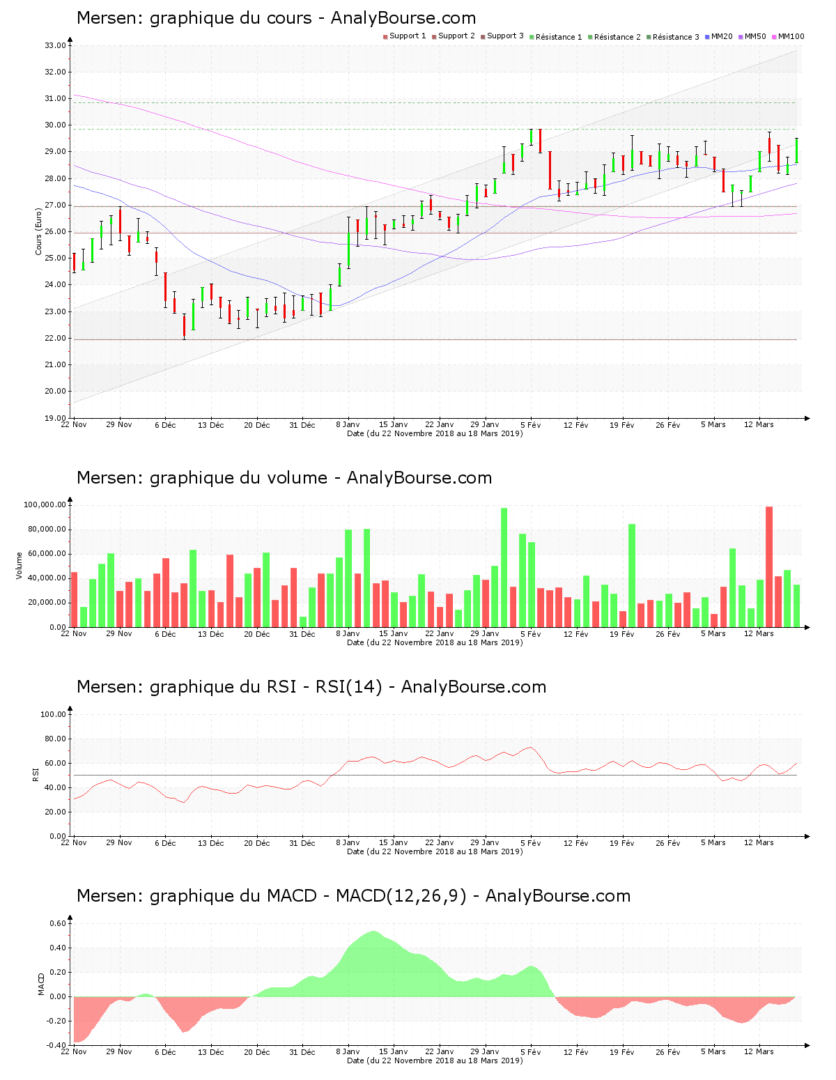 On constate que l’indicateur MACD est en vigoureuse augmentation ce jour. Aujourd’hui, le MACD est passé en secteur positif, ce qui peut suggérer un engagement d’une orientation haussière pour l’action Mersen à long terme.