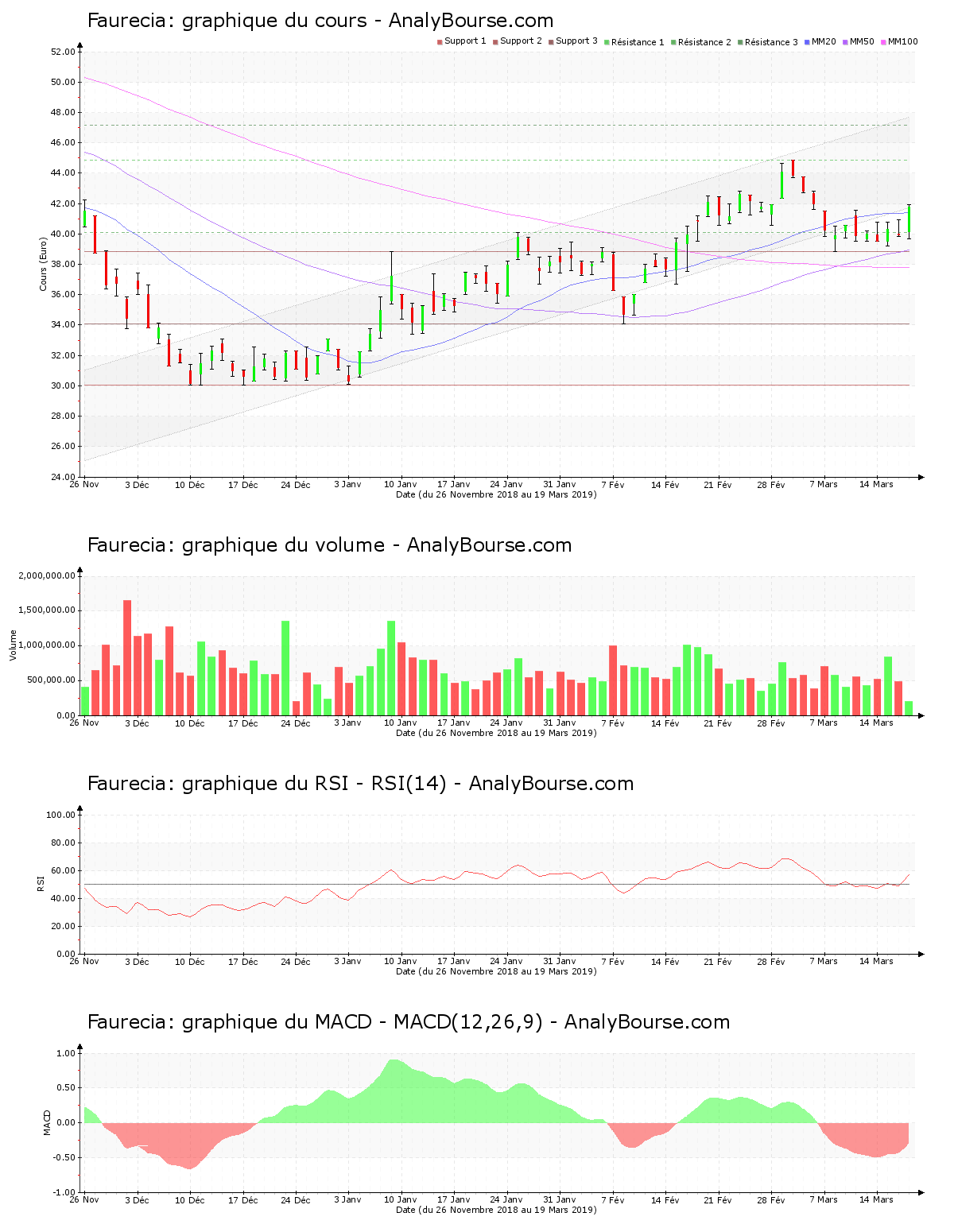 On relève que le MACD est en grande croissance ce mardi. Ce dernier suggère néanmoins toujours une tendance du titre en importante régression à moyen-court terme. L’indicateur RSI est en progression aujourd’hui. Il est passé au niveau d’achat, ce qui pourrait caractériser un prélude d’une orientation en progression sur la durée pour l’action Faurecia.