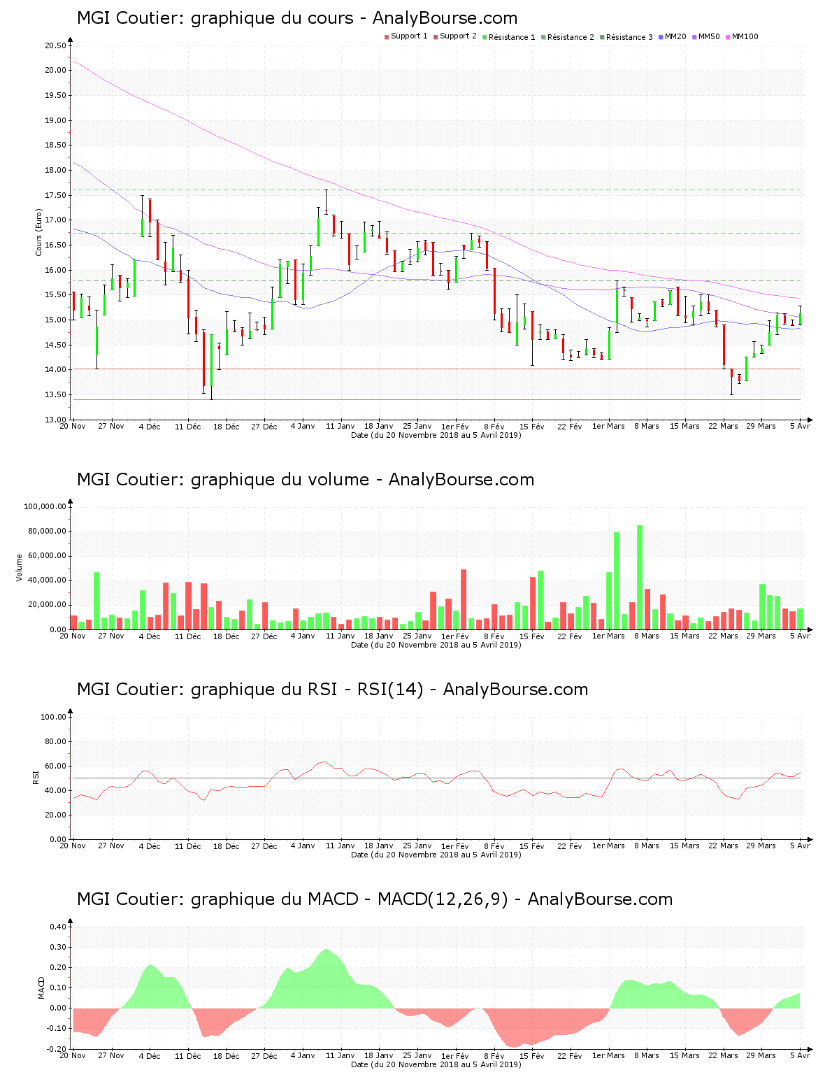 Pour les indicateurs, l’indicateur MACD est en vigoureuse hausse ces dernières séances. C’est désormais une trajectoire du cours en vigoureuse augmentation que ce dernier suggère sur le court-moyen terme. Mardi dernier, l’indicateur MACD est passé en territoire positif, ce qui pourrait révèler une amorce d’une trajectoire croissante à longue échéance pour MGI Coutier. Pour sa part, la moyenne mobile sur 20 jours de la valeur MGI Coutier est placée en-dessous de sa moyenne mobile sur 50 jours, qui est quant à elle localisée en deçà de sa moyenne mobile sur 100 jours. Le mouvement de la valeur est donc en diminution sur une longue période. Depuis maintenant 34 jours de cotations, la moyenne mobile sur 20 jours de l’action MGI Coutier se place en-dessous de sa moyenne mobile sur 50 jours. Pour finir, le RSI est ces cinq dernières séances en croissance. Ce dernier se localise dorénavant au niveau neutre.