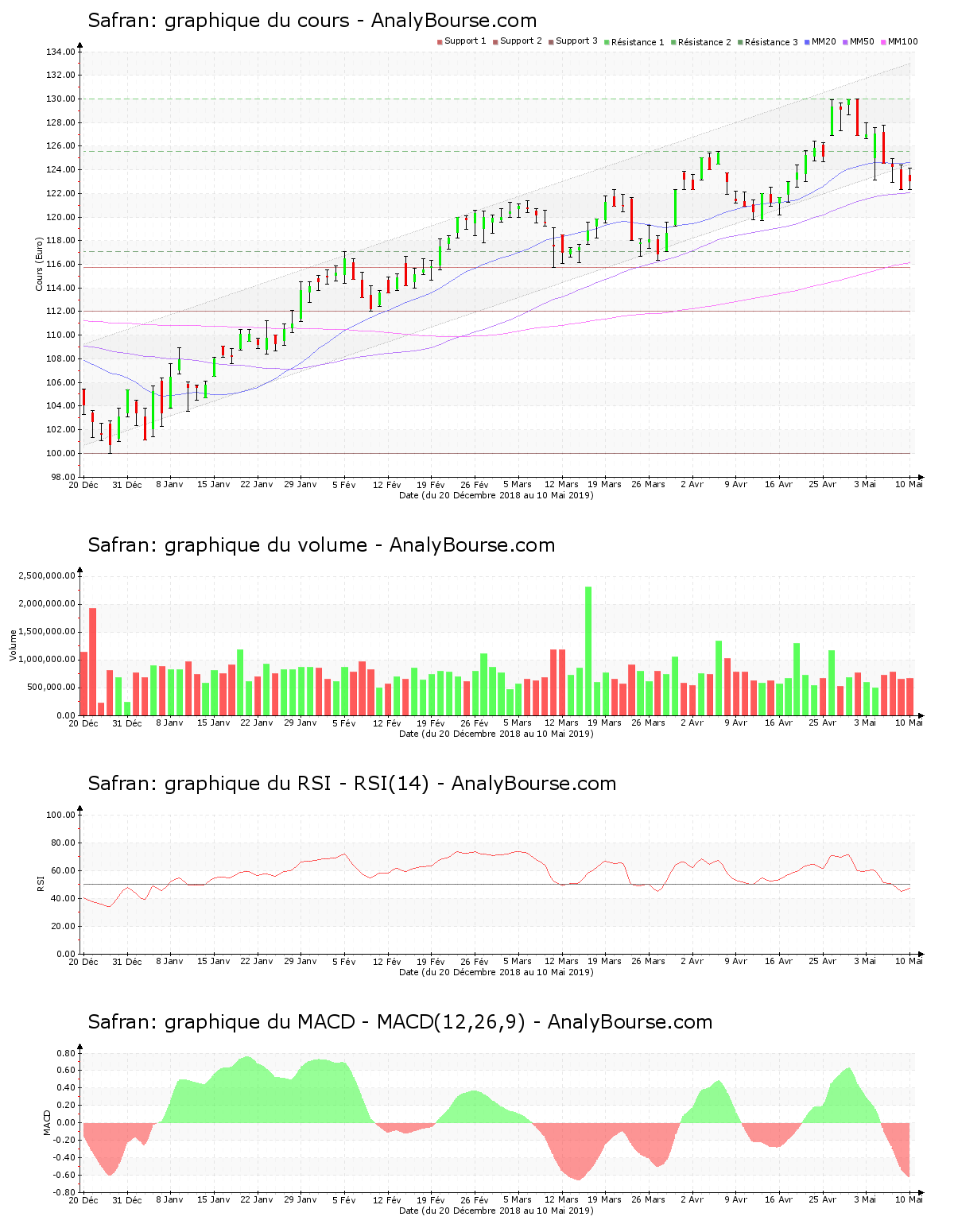 En ce qui concerne les indicateurs, le MACD est ces derniers jours en forte diminution. C’est maintenant une tendance du titre en grande régression que ce dernier esquisse à court-moyen terme. Mardi dernier, le MACD est passé du côté négatif, ceci peut indiquer une ébauche d’une orientation en décroissance sur le long terme pour Safran. La moyenne mobile sur 20 jours de l’action Safran est située au-delà de sa moyenne mobile sur 50 jours, qui est quant à elle située au-delà de sa moyenne mobile sur 100 jours. L’action traduit ainsi un parcours haussier sur une longue période. Depuis à présent 72 jours, la moyenne mobile sur 20 jours de l’action Safran se localise au-delà de sa moyenne mobile sur 50 jours. L’indicateur RSI est ces derniers jours en diminution. C’est désormais dans le niveau neutre qu’il se positionne.