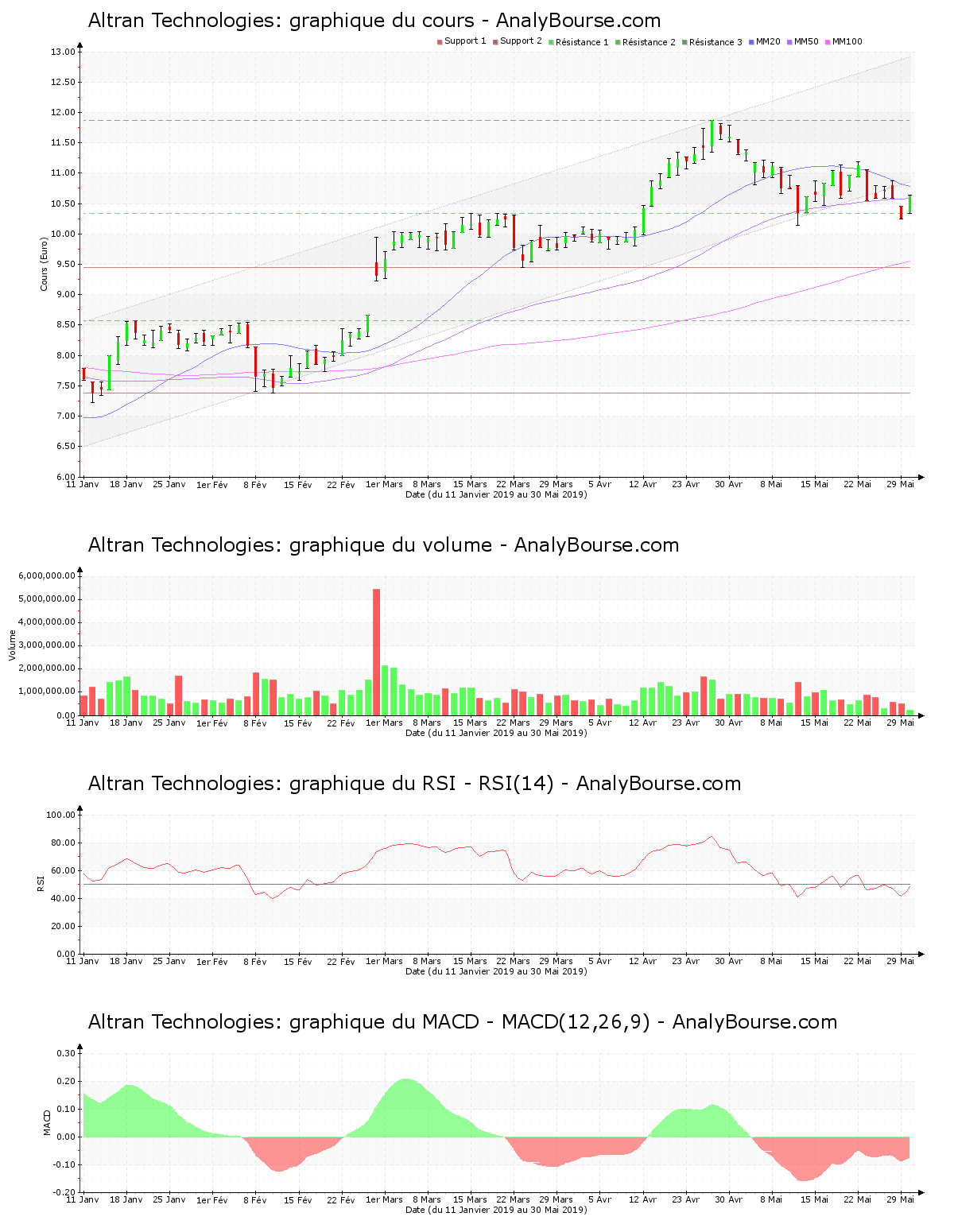 Dans un volume d’à peu près 212000 actions échangées à 15:40, le résultat est extrêmement bénéfique aujourd’hui pour Altran Technologies, avec un cours croissant de 3.51%. L’action se valorise maintenant à 10.620 €. Le bilan était à l’inverse franchement défavorable hier pour Altran Technologies, avec un cours décroissant de 3.12%. L’équilibre acheteurs/vendeurs se retourne donc avec vigueur ce jeudi 30 mai. Le titre a dépassé la résistance des 10.340 € ce jeudi 30 mai. La résistance suivante se localise à 11.190 €.