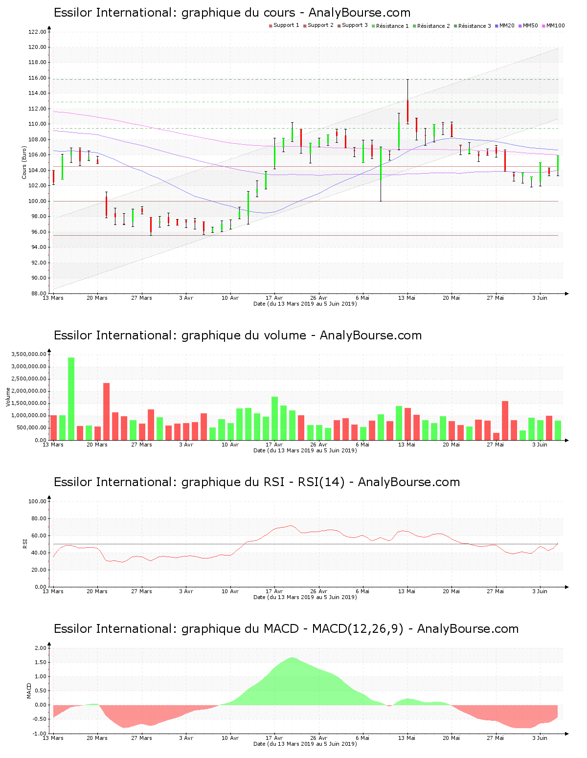 Concernant le MACD, on remarque que ce dernier est en vigoureuse augmentation aujourd’hui. C’est cependant toujours une tendance du titre en substantielle baisse que ce dernier révèle à moyen-court terme. On observe que ce mercredi le RSI est en progression. Il a basculé dans le niveau d’achat, ceci pourrait signaler une amorce d’une évolution en progression pour l’action Essilor International à longue échéance.
