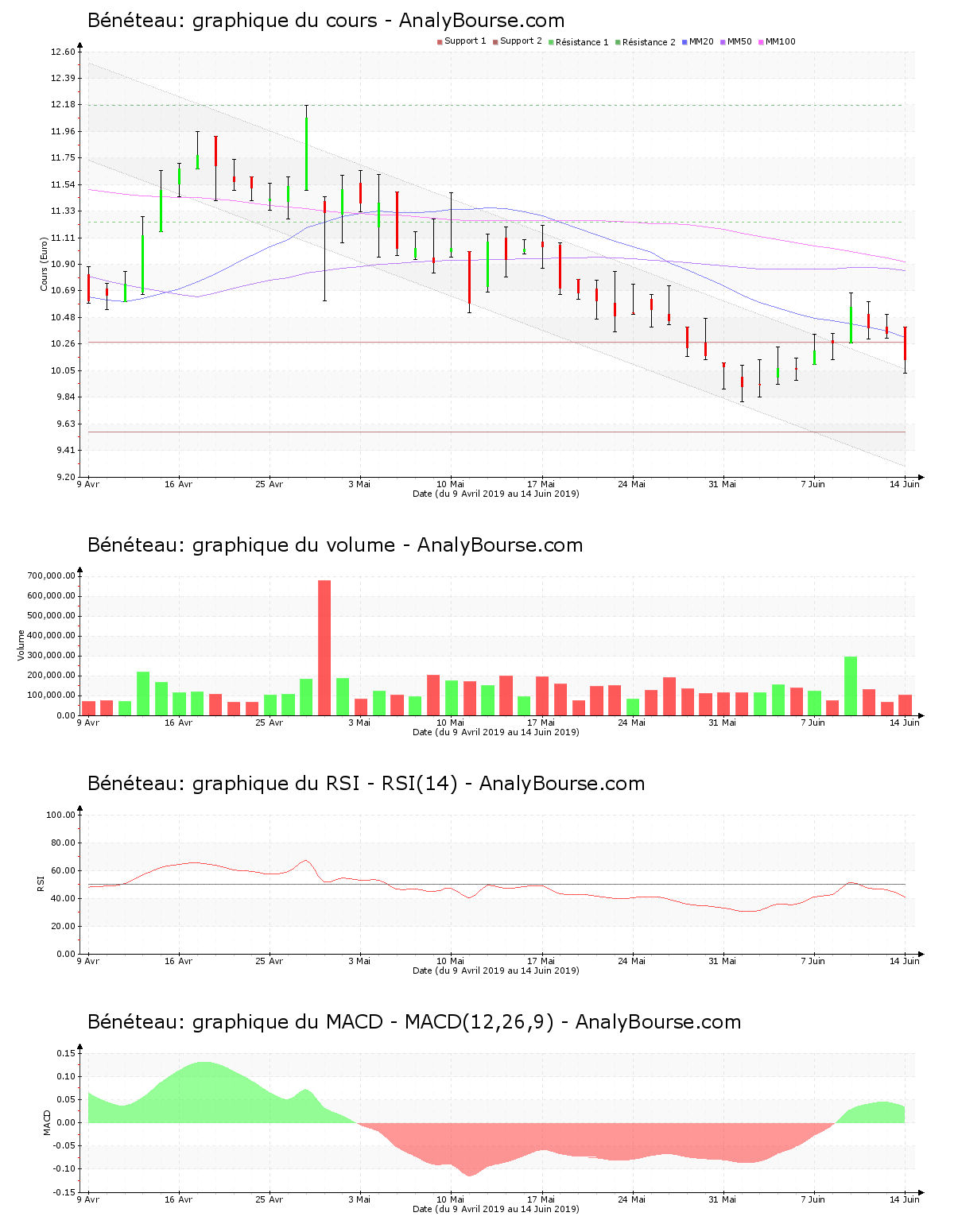L’action Bénéteau dispose d’une moyenne mobile sur 20 jours située en deçà de sa moyenne mobile sur 50 jours, qui est pour sa part positionnée en deçà de sa moyenne mobile sur 100 jours. La valeur traduit par conséquent un cours en baisse sur une longue période. De son côté, l’indicateur RSI est assez stable ces dernières séances. Il se situe donc encore dans le niveau de vente. Pour terminer, en ce qui concerne l’indicateur MACD, on repère qu’il est en forte croissance ces cinq derniers jours de cotations. C’est à présent une trajectoire du cours en augmentation que ce dernier dessine à moyen terme. Le MACD est passé du côté positif mardi dernier, ceci pourrait signaler une base d’une orientation croissante sur le long terme pour Bénéteau.