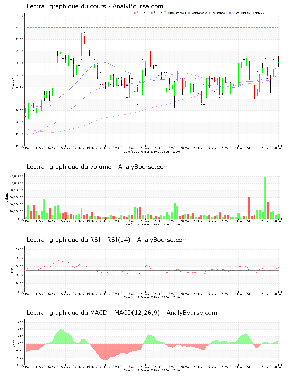 Ces informations constituent une analyse technique de l’action Lectra au samedi 29 juin 2019. Cette analyse peut être invalidée par des éléments plus récents, et ne constitue en aucune manière une incitation d’achat ou de vente sur les marchés financiers. Le lecteur reste libre et responsable de l’interprétation et de l’usage faits de ces informations.