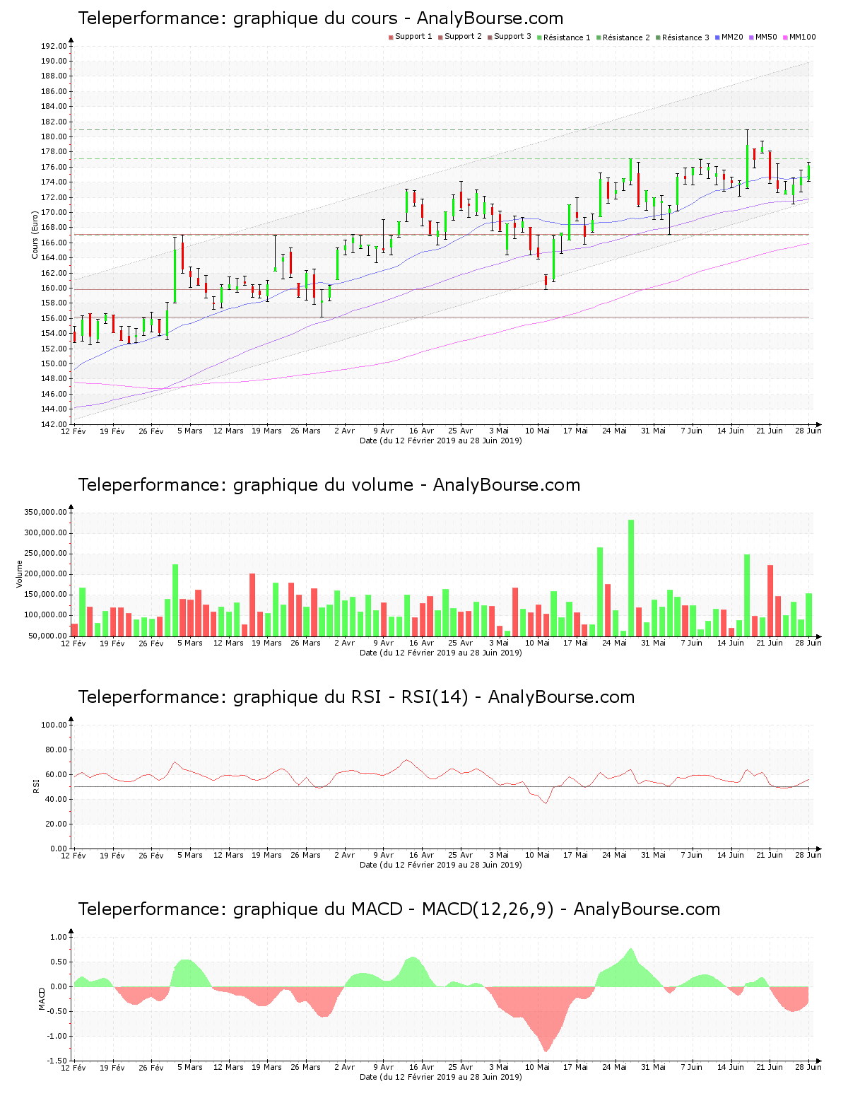 En ce qui concerne les indicateurs, la moyenne mobile sur 20 jours de la valeur Teleperformance se place au-delà de la moyenne mobile sur 50 jours, qui se localise quant à elle au-delà de la moyenne mobile sur 100 jours. Sur le long terme, la valeur exprime ainsi un comportement en croissance. Depuis maintenant 84 séances de cotations, la moyenne mobile sur 50 jours de la valeur Teleperformance se localise au-delà de sa moyenne mobile sur 100 jours. On observe que ces cinq derniers jours l’indicateur MACD est en substantielle décroissance. C’est maintenant une tendance du cours en vigoureuse baisse qu’il révèle à moyen terme. Enfin, on note que ces dernières séances le RSI est stable. C’est donc encore dans le niveau d’achat qu’il se positionne.