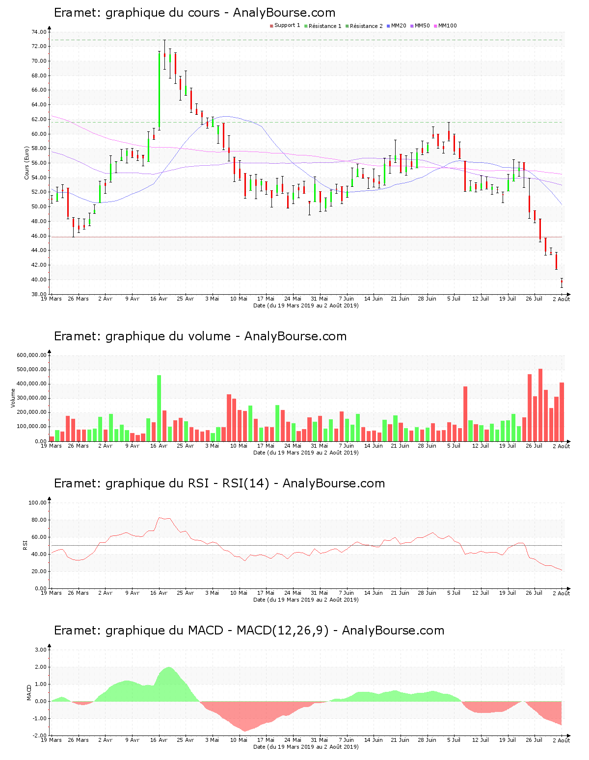 Concernant les indicateurs, la valeur Eramet dispose d’une moyenne mobile sur 20 jours placée en deçà de sa moyenne mobile sur 50 jours, qui est quant à elle localisée en-dessous de sa moyenne mobile sur 100 jours. La valeur traduit par conséquent un comportement baissier sur une longue période. De son côté, le RSI est cette semaine en diminution. Il se positionne dorénavant dans le niveau de survente. Pour finir, on observe que l’indicateur MACD est en vigoureuse baisse ces cinq derniers jours de cotations. C’est dorénavant une évolution du cours en vigoureuse diminution que ce dernier dessine à moyen-court terme.