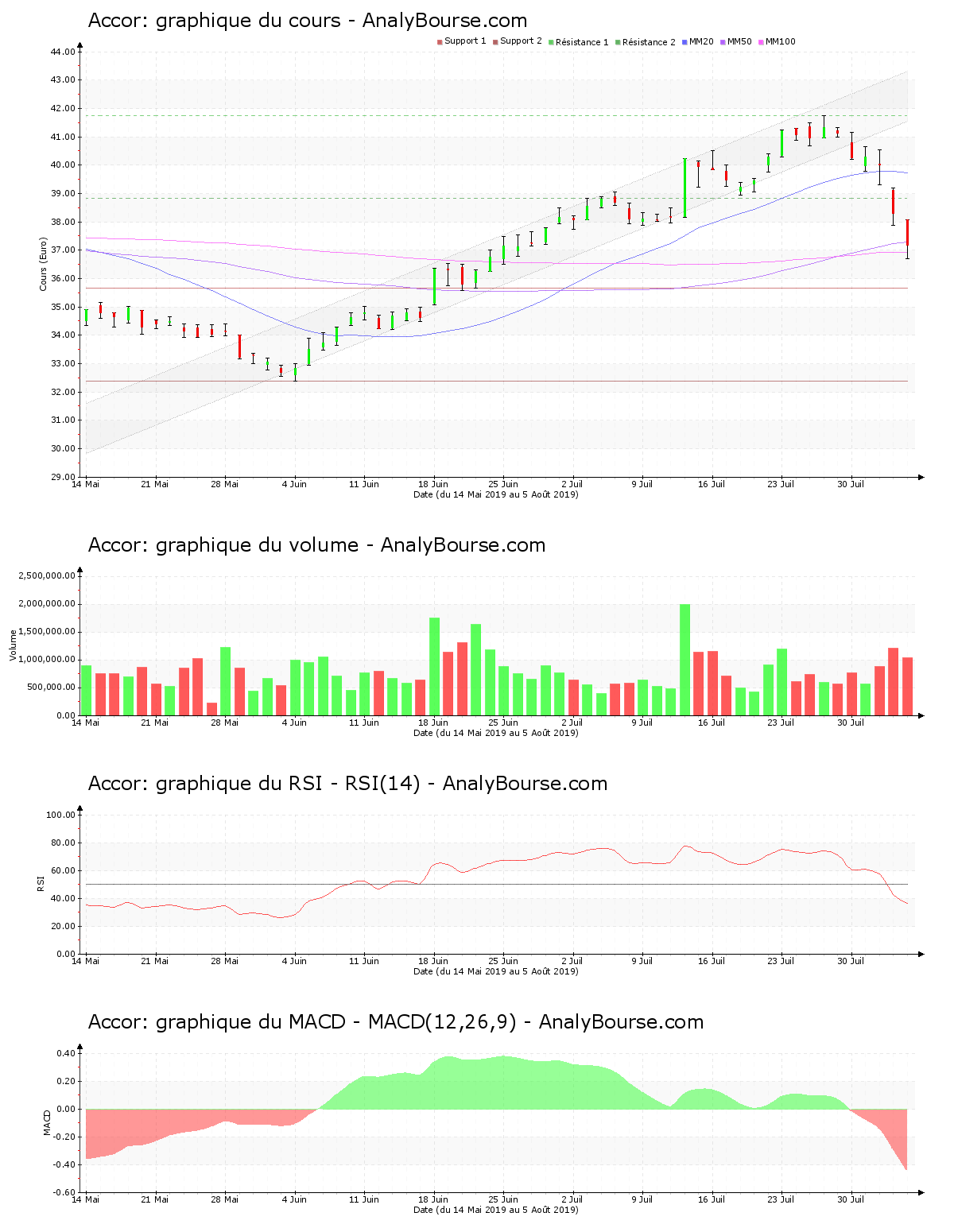 Avec un mouvement en grande baisse de 2.90%, la valeur Accor est toujours ce lundi affectée, avec un volume à la clôture d’environ 1 million d’actions échangées. Cette dernière était déjà en importante régression vendredi dernier, avec un cours décroissant de 4.28%. L’action s’écroule finalement de 1.110 €, évoluant de 38.290 € à 37.180 €. On observe une relative fébrilité ce lundi sur le titre, avec un taux de 3.73% qui éloigne les extrêmes de Accor. Le parcours du titre le conduit désormais à proximité du support des 35.670 €.