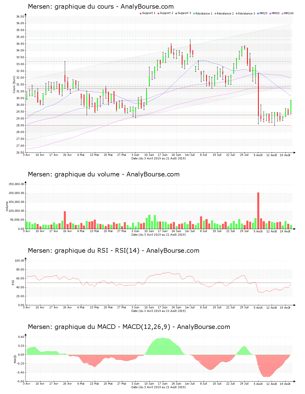 Pour les indicateurs, on remarque que ce jour le MACD est en solide augmentation. L’indicateur MACD a basculé en secteur positif ce mercredi 21 août, ceci pourrait montrer un amorcement d’une trajectoire en croissance sur le long terme pour la valeur Mersen.