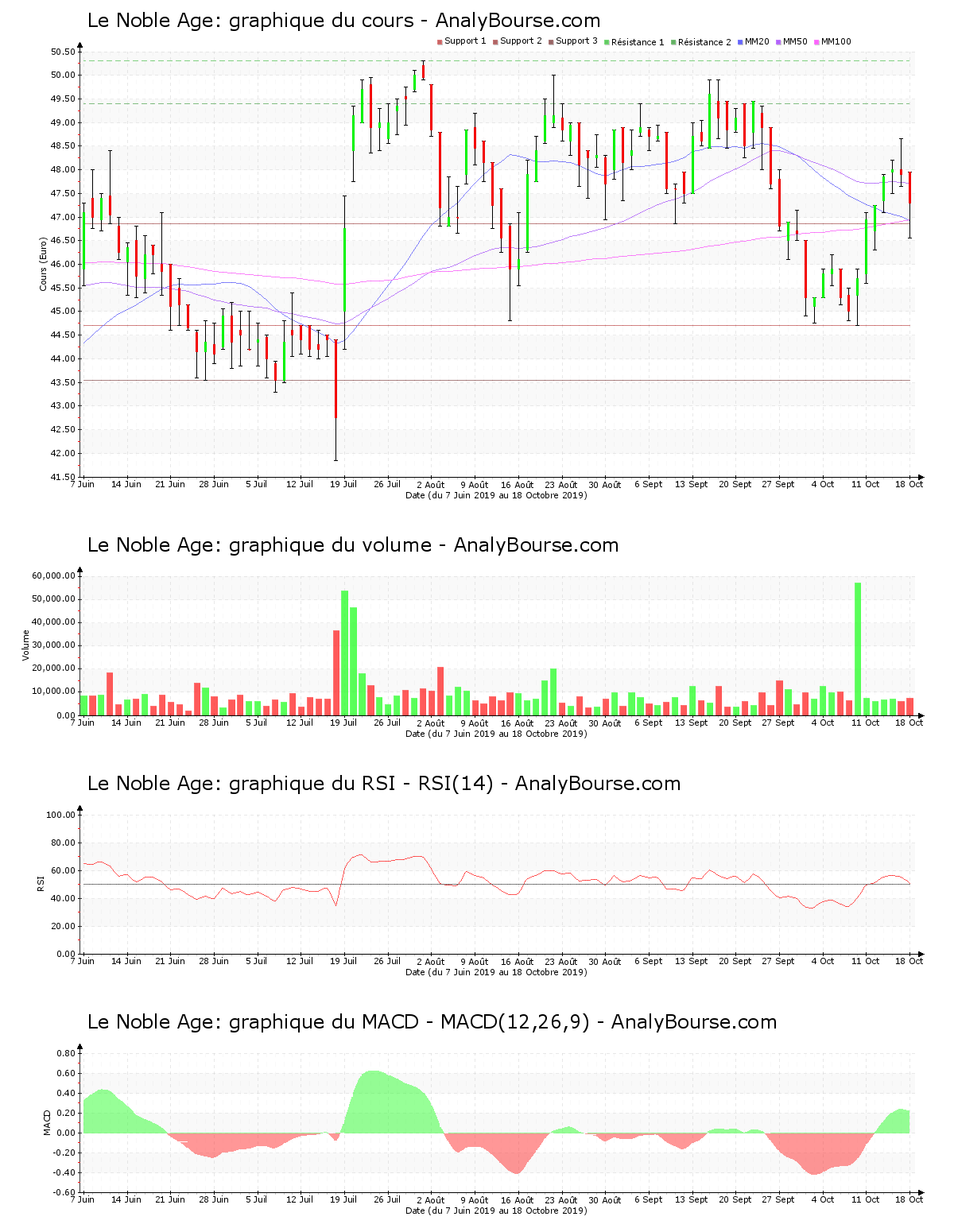 Du côté des indicateurs, depuis désormais 56 jours, la moyenne mobile sur 50 jours de la valeur Le Noble Age se localise au-delà de sa moyenne mobile sur 100 jours. Ensuite, l’indicateur RSI est en augmentation ces derniers jours. Ce dernier se situe finalement au niveau neutre. Pour l’indicateur MACD, on relève qu’il est en importante croissance ces cinq derniers jours. C’est dorénavant une tendance du titre en vigoureuse progression que ce dernier suggère à moyen-court terme. L’indicateur MACD est passé en secteur positif lundi dernier, cela pourrait esquisser un enclenchement d’une évolution croissante sur la durée pour Le Noble Age.