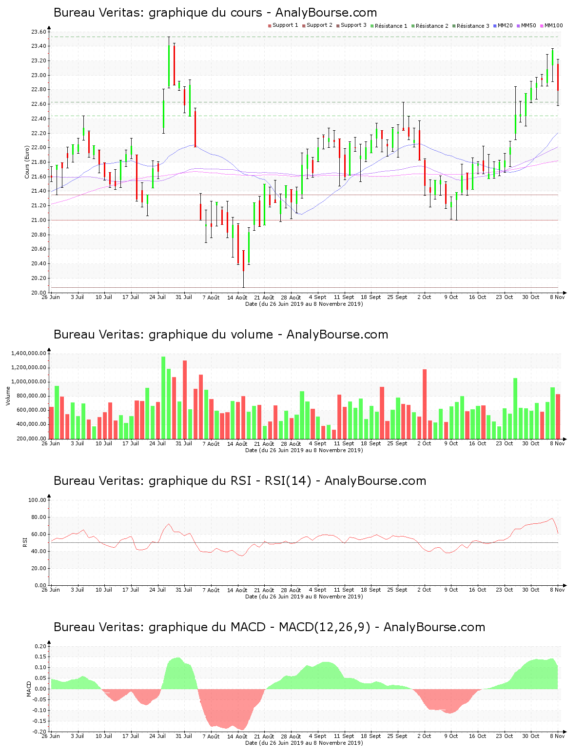 En ce qui concerne les indicateurs, le RSI est en baisse ces dernières séances. C’est cependant encore au niveau d’achat qu’il se situe. De son côté, on remarque que ces derniers jours le MACD est en décroissance. C’est cependant encore une tendance du cours en substantielle progression qu’il révèle à moyen terme. L’action Bureau Veritas dispose d’une moyenne mobile sur 20 jours localisée au-dessus de sa moyenne mobile sur 50 jours, qui est quant à elle située au-delà de sa moyenne mobile sur 100 jours. ? longue échéance, l’action présente par conséquent un comportement haussier.