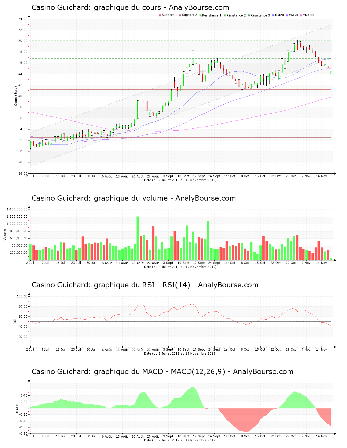 Ceci fait à présent 8 séances de cotations que la valeur Casino Guichard est en régression. Le titre de Casino Guichard est donc depuis le vendredi 8 novembre 2019 attaqué, avec un parcours en solide régression de 9.03%. Avec un volume à 09:46 de sensiblement 64000 titres échangés, avec un développement baissier de 1.20%, le bilan est toujours négatif ce mardi pour la valeur Casino Guichard. Cette dernière affichait déjà hier une pression vendeuse, quantifiée par un parcours baissier de 1.27%. La valeur atteint désormais la cotation de 44.540 €.