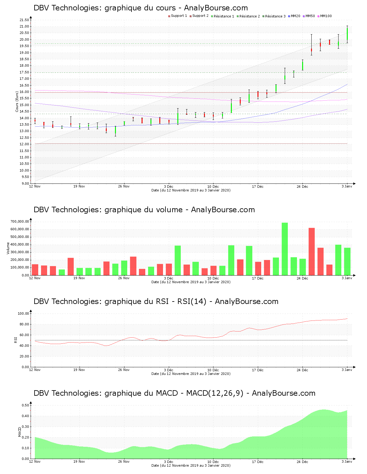 La valeur DBV Technologies explose toujours ces dernières séances, avec un parcours haussier de 14.05%. L’action bondit désormais de 2.570 €, commençant à 18.290 € pour accéder à 20.860 € ces cinq dernières séances de cotations. Avec un cours en hausse de 17.02%, elle explosait déjà la semaine dernière. Avec un cours en hausse de 33.46% en deux semaines, le résultat est ainsi très bon en deux semaines de cotations pour le titre de DBV Technologies. On remarque également sur le cours l’existence d’un gap à la hausse cette semaine le vendredi 27 décembre 2019. Enfin, le titre a passé la résistance des 19.700 € cette semaine. La valeur a franchi la limite supérieure du canal à l’intérieur duquel cette dernière se déployait ces dernières semaines. Elle se localise maintenant au-delà de son canal. Depuis que cette dernière s’est retrouvée dans le canal le mercredi 20 novembre 2019, l’action a récolté 54.86%.