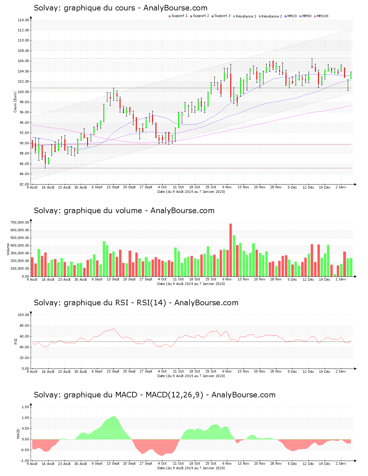 Du côté des indicateurs, on observe que le RSI est en croissance ce mardi. Il est passé dans le niveau d’achat, ce qui pourrait suggérer un commencement d’une trajectoire en croissance sur la durée pour la valeur Solvay. Le MACD est aujourd’hui stable. Ce dernier représente donc toujours une évolution du cours en vigoureuse régression sur le moyen-court terme.