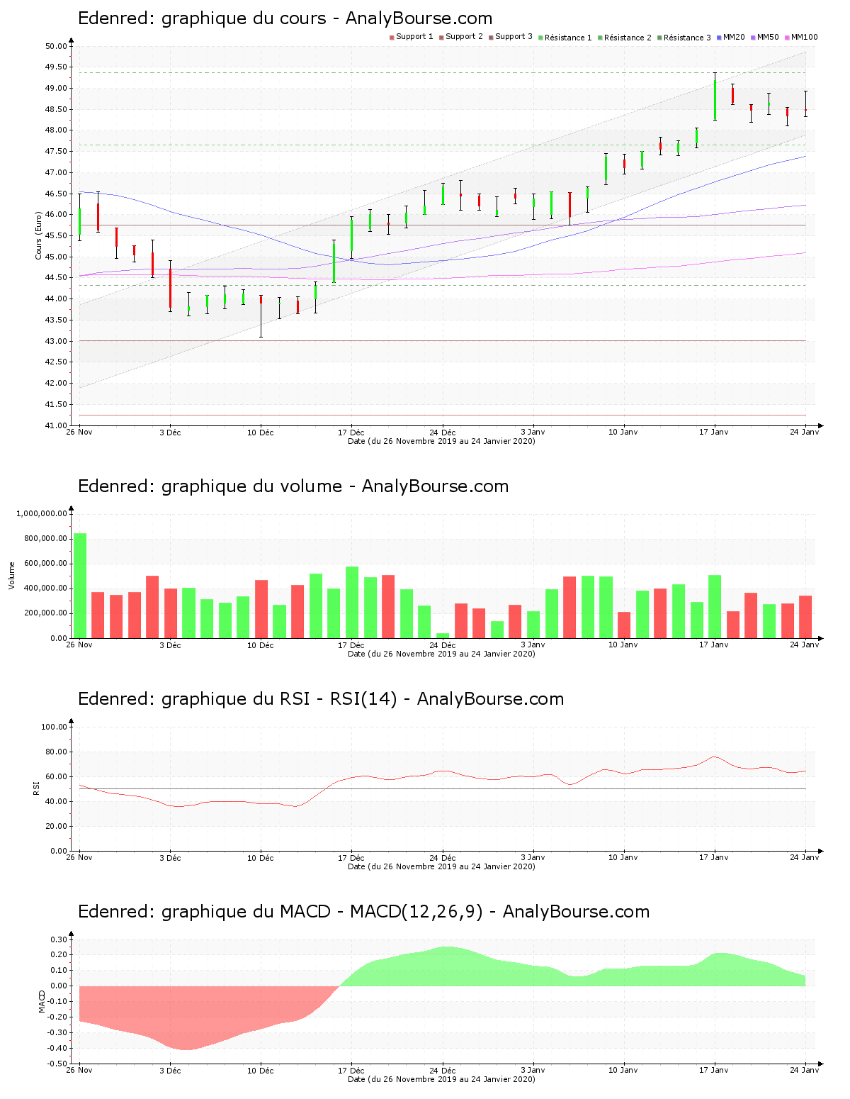 Du côté des indicateurs, on relève que ces cinq derniers jours de cotations le RSI est en diminution. C’est toutefois toujours au niveau d’achat que ce dernier se situe. La valeur Edenred dispose d’une moyenne mobile sur 20 jours située au-delà de sa moyenne mobile sur 50 jours, qui est elle-même positionnée au-dessus de sa moyenne mobile sur 100 jours. La valeur montre donc un mouvement en croissance sur le long terme. Voilà dorénavant 40 séances de cotations que la moyenne mobile sur 50 jours de l’action Edenred se place au-delà de sa moyenne mobile sur 100 jours. Enfin, on constate que ces cinq dernières séances l’indicateur MACD est en vigoureuse baisse. Ce dernier révèle cependant encore une tendance du cours en grande progression à court-moyen terme.