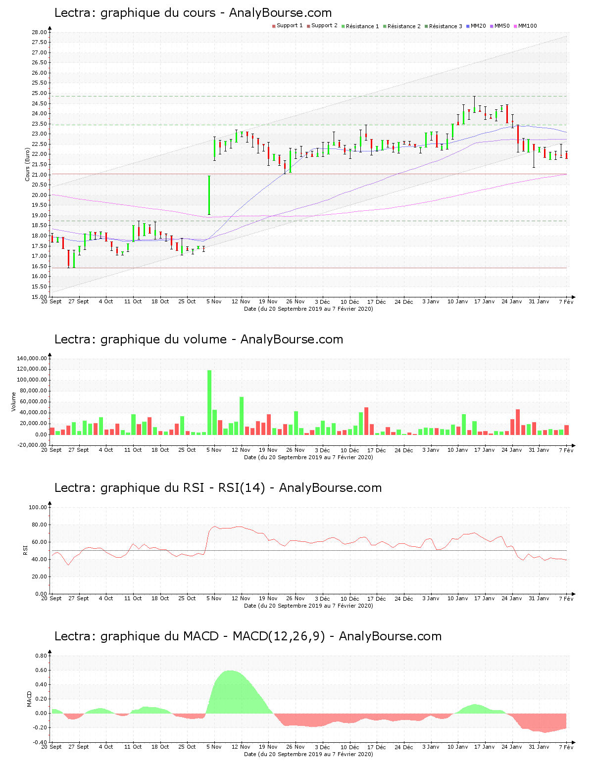 La moyenne mobile sur 20 jours de la valeur Lectra est positionnée au-dessus de sa moyenne mobile sur 50 jours, qui est elle-même localisée au-delà de sa moyenne mobile sur 100 jours. La valeur enregistre ainsi un parcours haussier à longue échéance. Depuis maintenant 67 jours, la moyenne mobile sur 20 jours de la valeur Lectra se situe au-dessus de sa moyenne mobile sur 50 jours. Concernant le MACD, on note que ce dernier est en croissance ces cinq dernières séances. C’est malgré tout toujours une tendance du titre en forte diminution qu’il signale sur le moyen-court terme. Enfin, concernant le RSI, on remarque qu’il est stable ces derniers jours. Ce dernier se trouve ainsi encore dans le niveau de vente.