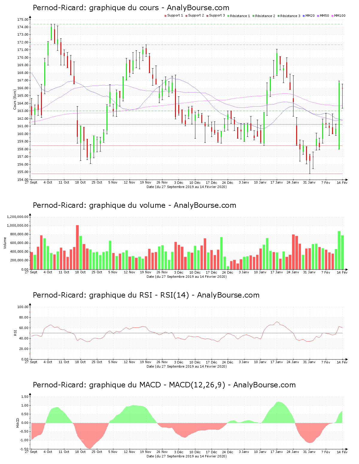 En ce qui concerne les indicateurs, la moyenne mobile sur 20 jours de l’action Pernod-Ricard a croisé la moyenne mobile sur 50 jours jeudi dernier. La moyenne mobile sur 20 jours de l’action Pernod-Ricard se situe en deçà de la moyenne mobile sur 50 jours, qui se positionne pour sa part en deçà de la moyenne mobile sur 100 jours. Sur la durée, l’action traduit ainsi un cours baissier. Depuis à présent 38 séances de cotations, la moyenne mobile sur 50 jours de la valeur Pernod-Ricard se situe en deçà de sa moyenne mobile sur 100 jours. Ensuite, l’indicateur MACD est cette semaine en solide croissance. C’est désormais une évolution du cours en solide progression que ce dernier dévoile à moyen terme. Le MACD est passé en secteur positif mercredi dernier, cela peut signaler un départ d’une trajectoire haussière à longue échéance pour Pernod-Ricard. Pour finir, concernant le RSI, on constate qu’il est en hausse ces cinq derniers jours. C’est finalement dans le niveau d’achat qu’il se situe.