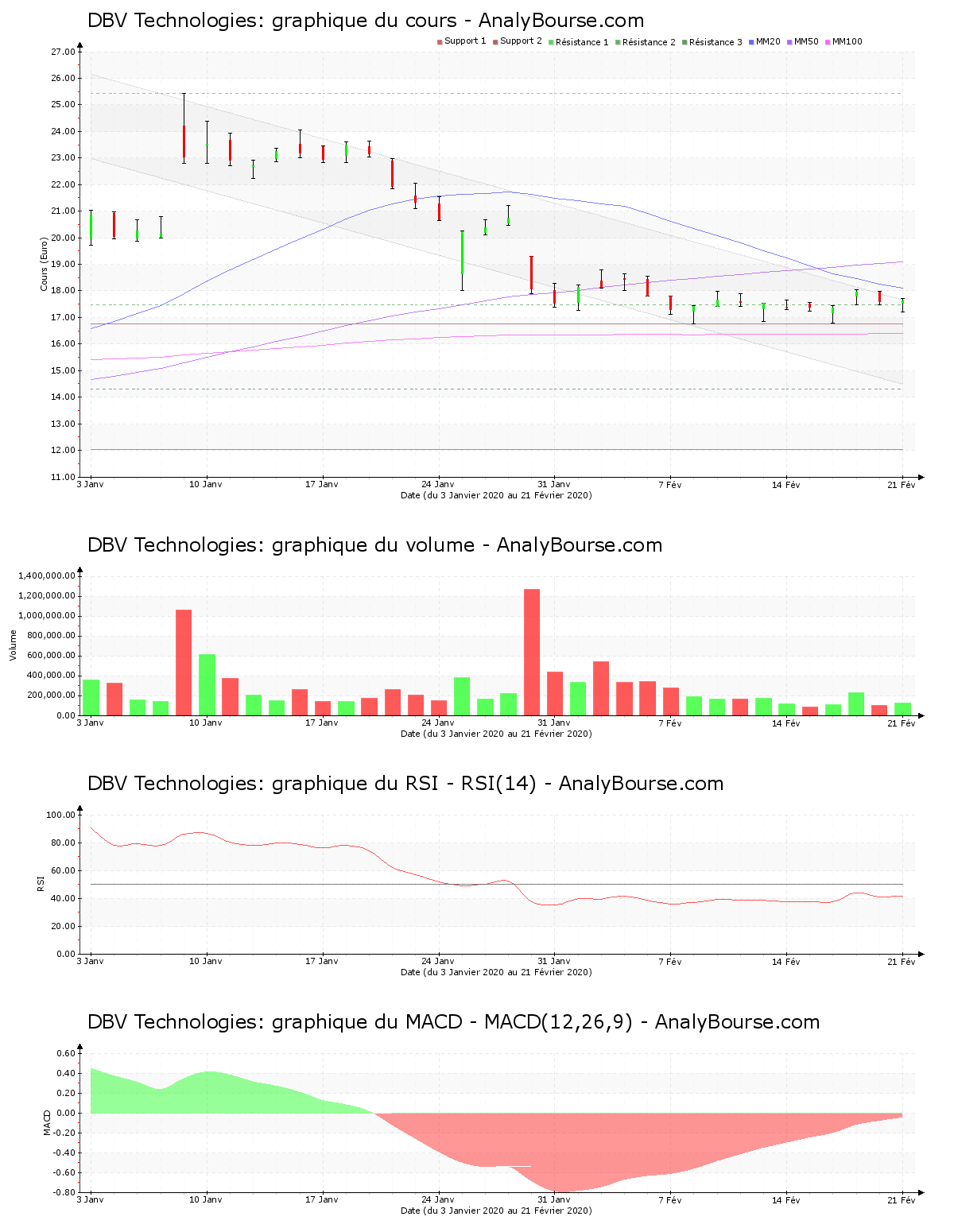 Côté indicateurs, on observe que l’indicateur RSI est relativement stable ces cinq derniers jours de cotations. Il se situe ainsi toujours dans le niveau de vente. Ensuite, la moyenne mobile sur 20 jours de l’action DBV Technologies se trouve en-dessous de sa moyenne mobile sur 50 jours depuis lundi dernier. Pour finir, on repère que ces cinq dernières séances de cotations le MACD est en grande progression. Ce dernier montre néanmoins encore une tendance du titre en baisse à moyen terme.